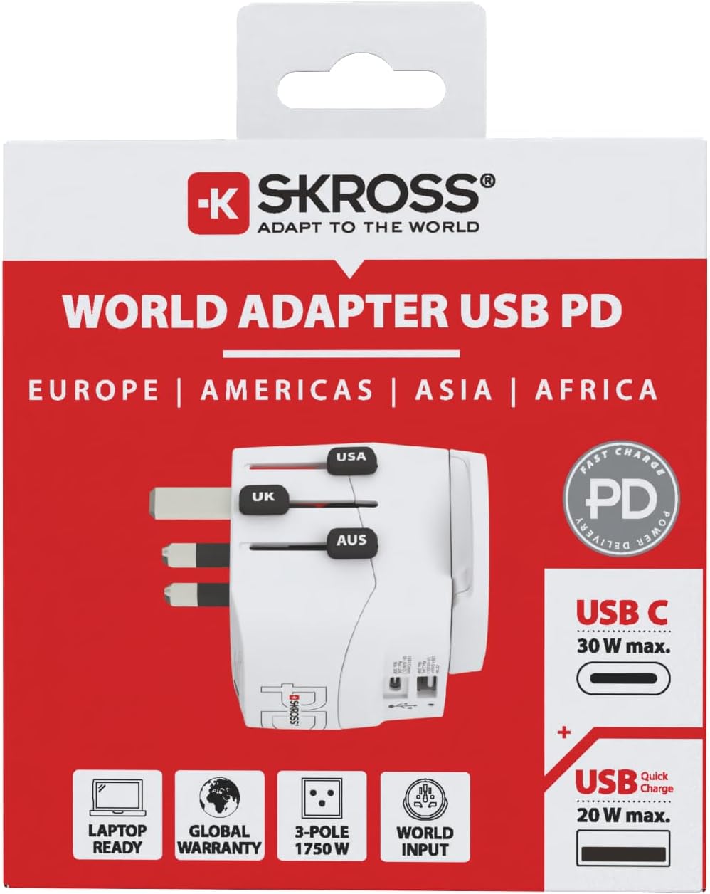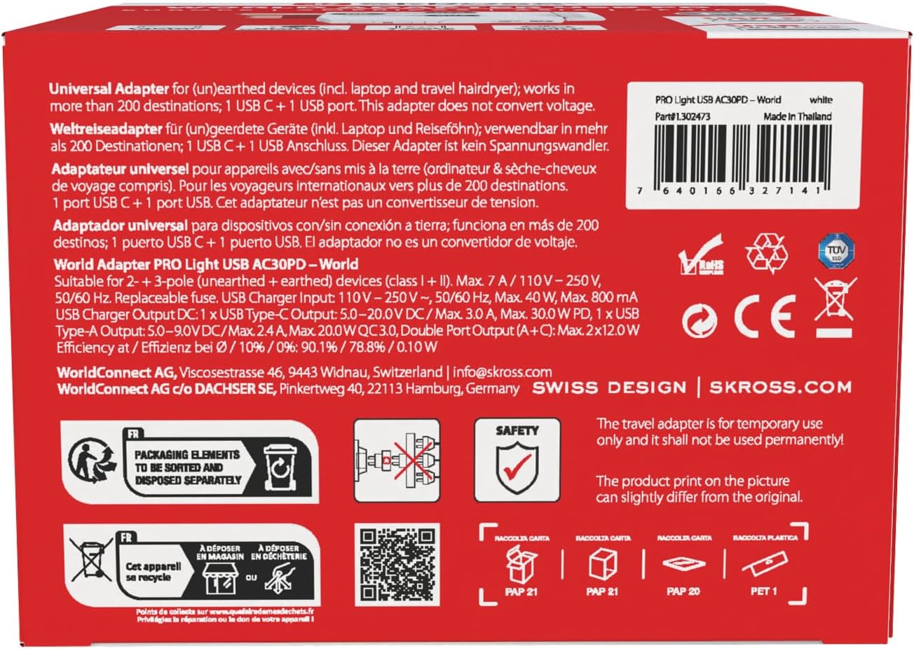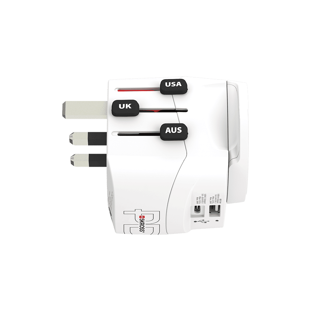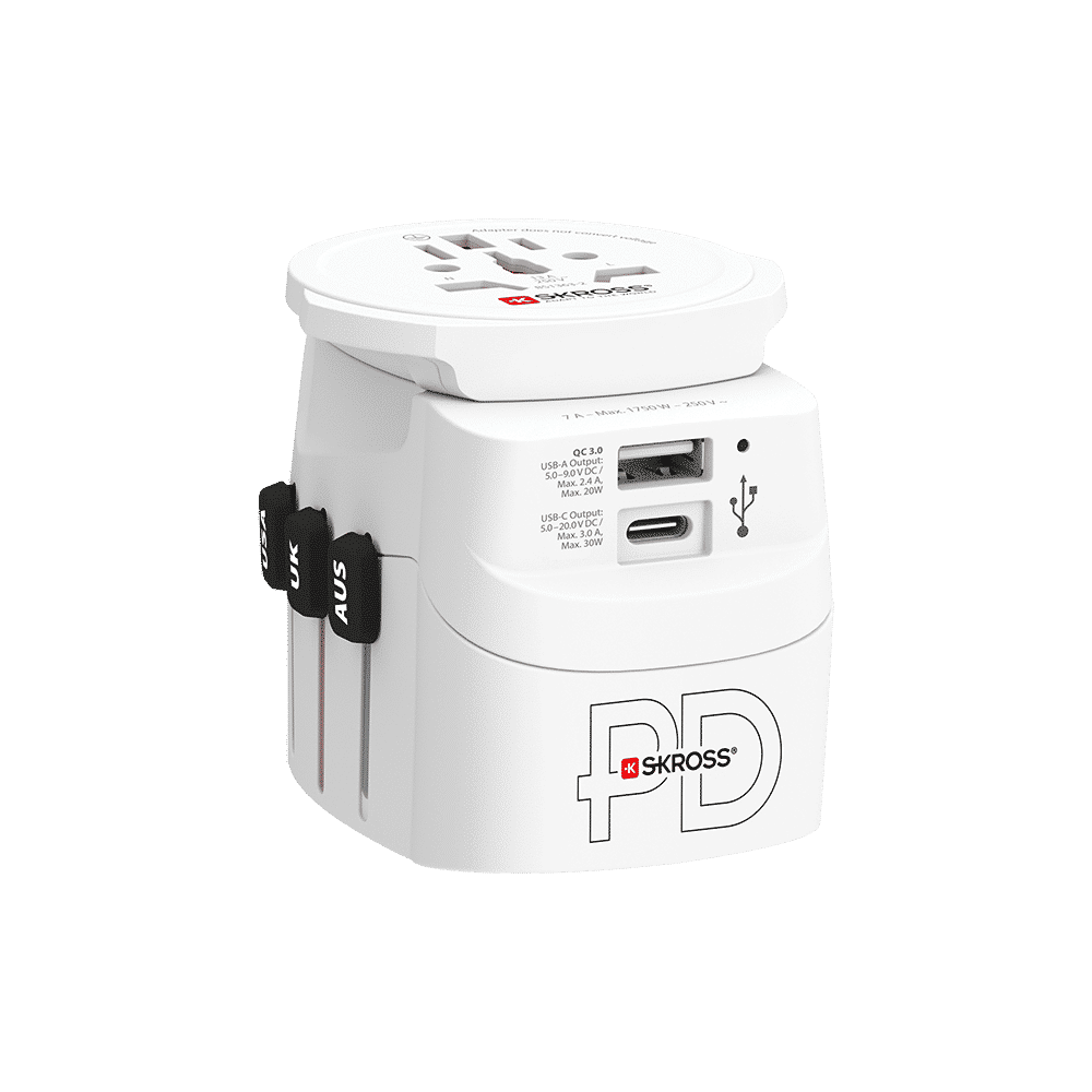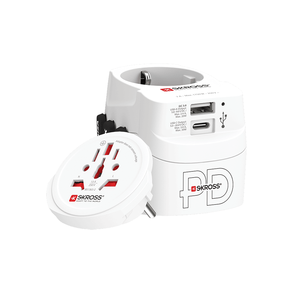 • محول السفر المدمج ذو 3 سنون مع شاحن USB PD سريع الشحن (1 × USB C و 1 × USB) يضمن PRO Light USB AC30PD - World اتصالاً بسيطاً وآمناً للأجهزة ذات 2 و 3 سنون من جميع أنحاء العالم إلى أكثر من 200 وجهة.