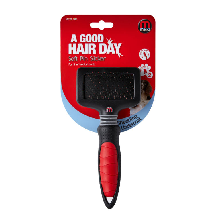 يحتوي Mikki Soft Pin Slicker على دبابيس ذات شكل خاص مثبتة على وسادة هوائية لتعزيز عملية التمشيط وتقليل أي قوة تمشيط مفرطة.