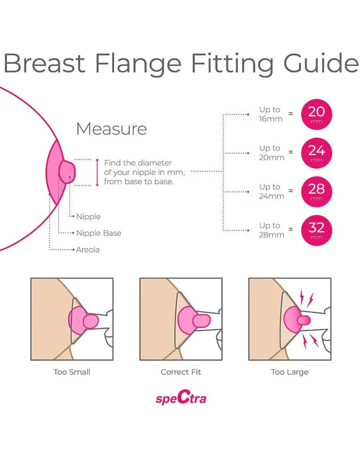 حلمة الثدي Spectra® ذات العنق العريض متوافقة مع جميع مضخات Spectra® الكهربائية (*بالنسبة للطرازات المزدوجة، تحتاجين إلى قطعة محول الأنابيب). وهي متوفرة بأحجام مختلفة.