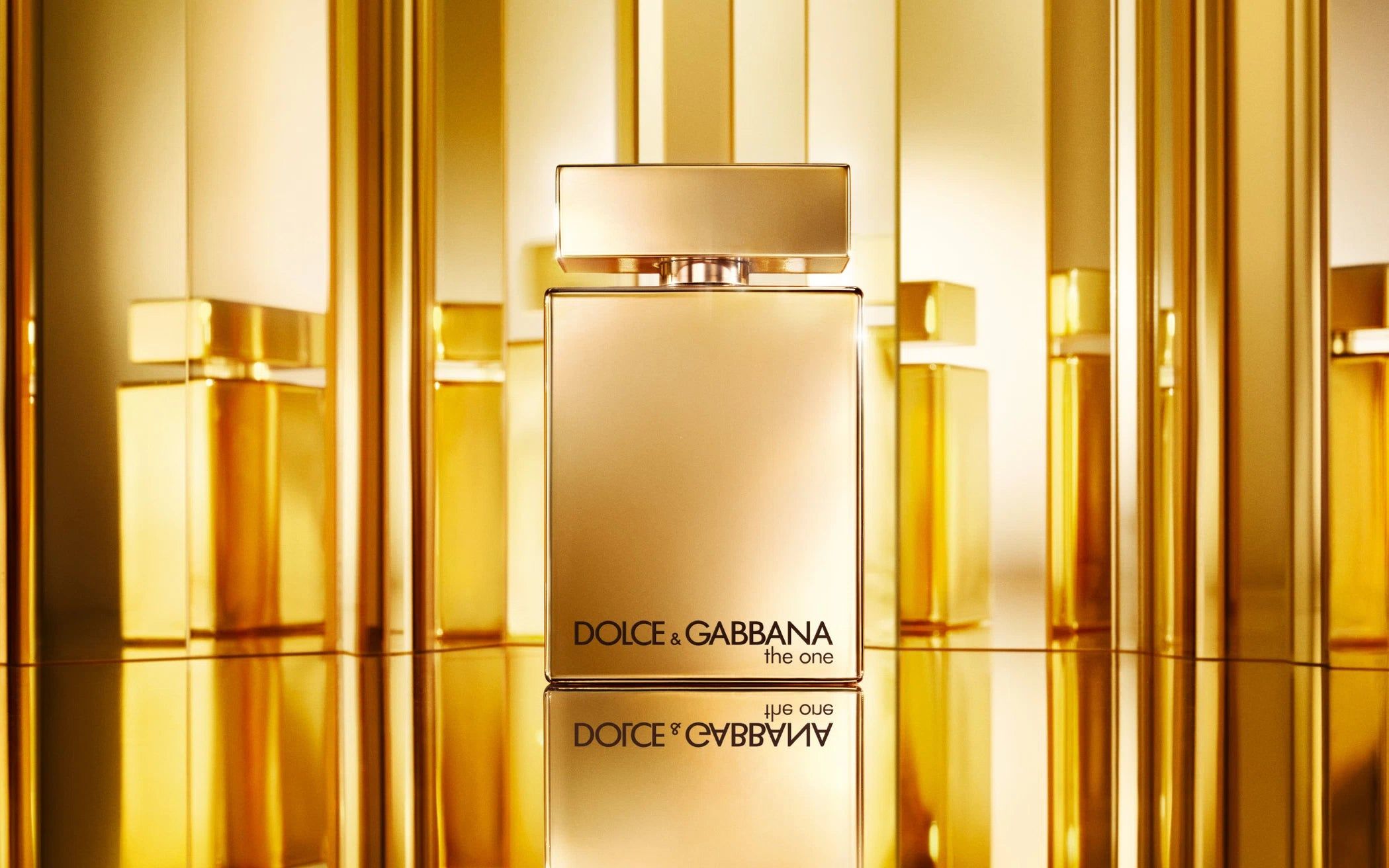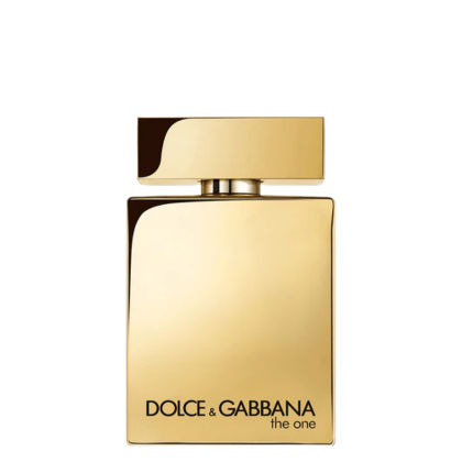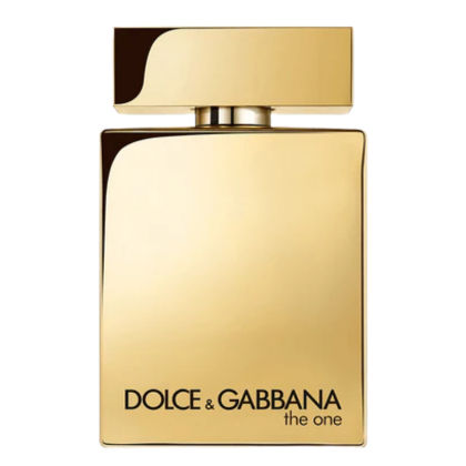يعيد تصميم زجاجة عطر "The One for Men Gold Eau de Parfum Intense" من Dolce&Gabbana تصور الخطوط الأساسية للزجاجة الأصلية، مزينة بطلاء ذهبي لافت للنظر.