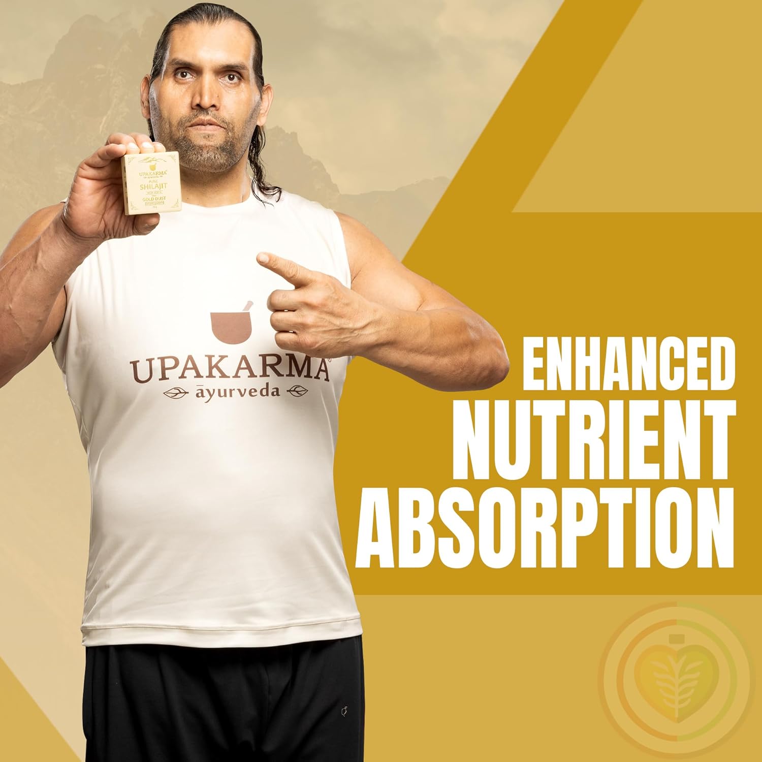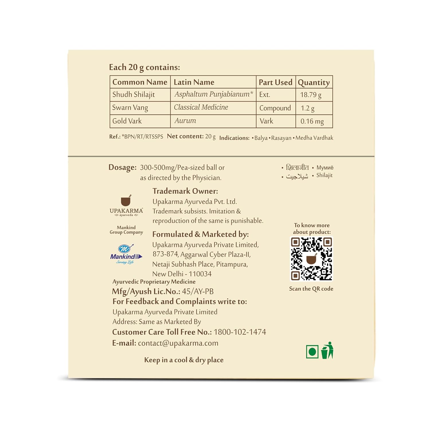 استمتع بالحيوية مع Upakarma Shilajit Gold Dust Resin - 20 جرام. مكمل غذائي أيورفيدا فاخر غني بغبار الذهب لتعزيز الطاقة والمناعة وتجديد الشباب.