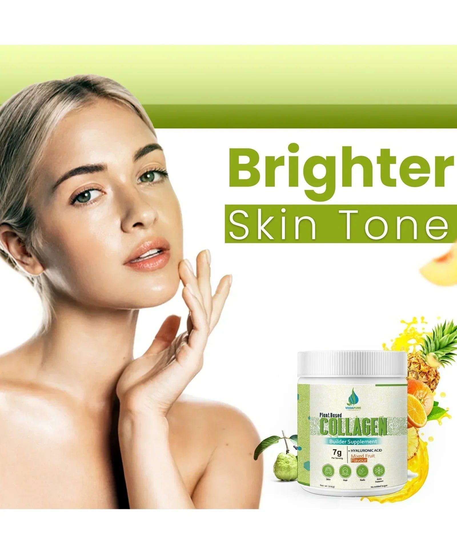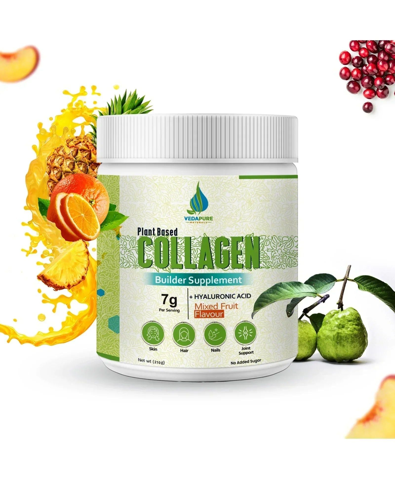 مسحوق الكولاجين النباتي من VedaPure هو تركيبة طبيعية 100٪ نباتية تحتوي على مكونات مثل البيوتين وفيتامين C ومسحوق عصير السبانخ ومستخلص الشاي الأخضر التي تلعب دورًا مهمًا في الحفاظ على صحة البشرة، وتساعد على تعزيز مستويات الكولاجين الطبيعي وتقليل الخطوط الدقيقة والتجاعيد، فضلاً عن مرونة وترطيب البشرة.