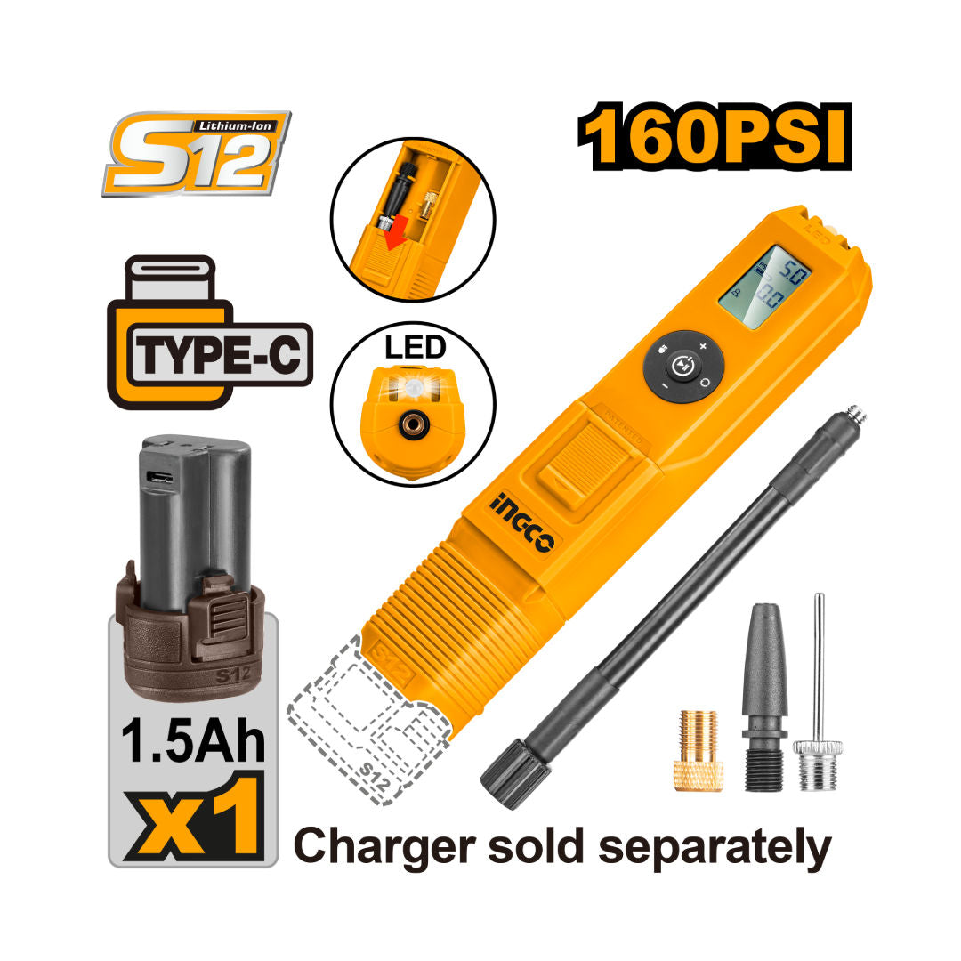 • 12V cordless auto air compressor with maximum pressure of 160 PSI (11 Bar)