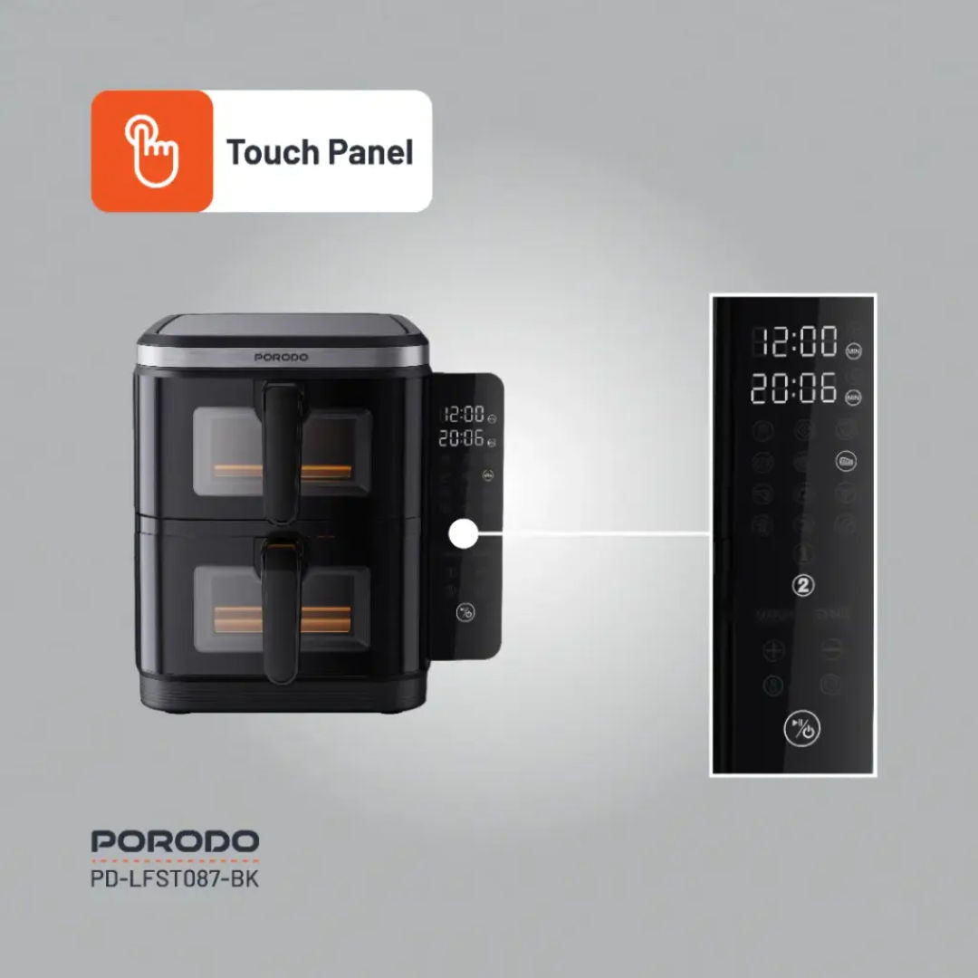 The Porodo Lifestyle double-stack air fryer with 12 pre-set cooking options is an incredible multipurpose all-in-one gadget that will cater to your best cooking experience. This workhorse is dual-heating with an impressive 2800W total (1400W each unit) and a spacious 11L capacity (5.5L + 5.5L). In that case, it lets you fry multiple items at once, making it a perfect tool for large families and gatherings. Its 12 preset cooking options offer frying, baking, grilling, and more versatility. At the same time, the upper temperature range of 60-200 degrees Celsius and a timer of 60 minutes will allow you full control over your recipes. Its only black, sleek touch panel and info display would ensure easy operation while its high-efficacy cooking technology reduces the oil count for healthier meals. A UK 3-pin plug suitable for a standard voltage (220-240 volts) as well as standard frequency work (50-60 hertz), is also very convenient to use. With its stylish black design and user-friendly features, this air fryer is a true gem in modern kitchens.