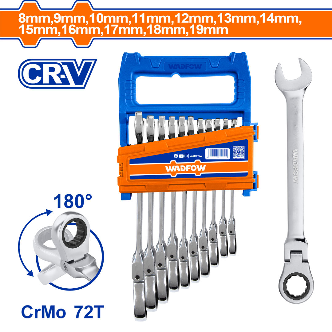 WADFOW 12 Pieces Flexible Ratchet Spanner Set, 8-19mm, Cr-Mo ratchet, Cr-V bodies