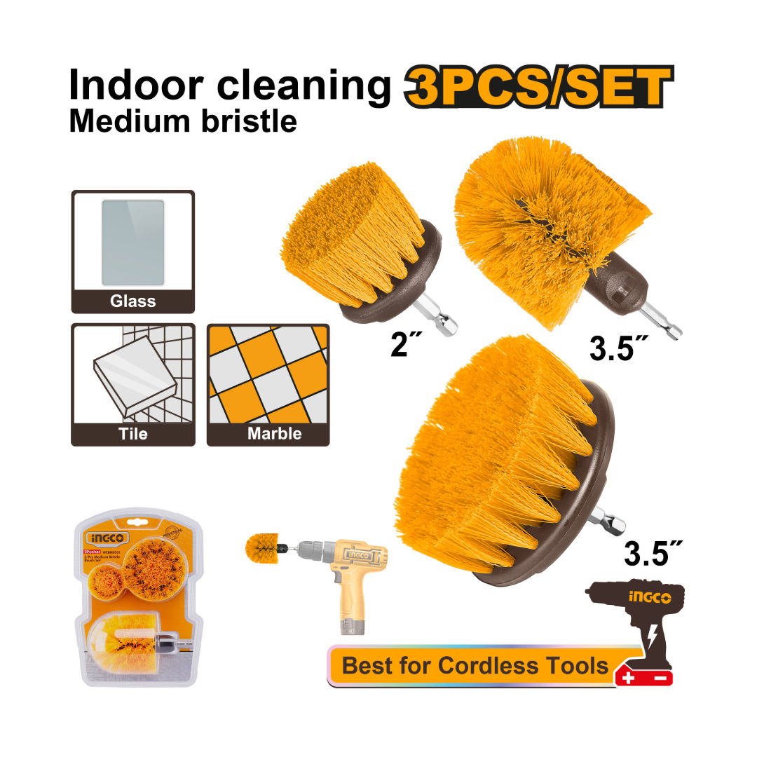 INGCO 3-Pcs Medium Bristle Brush Set Drill, 2", 3.5, 3.5" Round; 1/4" Hex