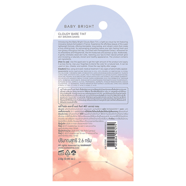 Introducing the Baby Bright Cloudy Bare Tint, a light-as-cloud lip tint featuring innovative texture formulated in France. Experience the effortless beauty of this super lightweight formula, offering blendable, long-lasting, and vibrant colors that create a truly striking look. Its rejuvenating properties leave your skin feeling fresh and non-greasy throughout the day. Enriched with Pomegranate Extract, renowned for its antioxidants and Polyphenols, this tint moisturizes and plumps up lips. Additionally, it gently exfoliates dead skin cells, restoring your lips to their natural pinkish glow and revealing a naturally vibrant and healthy appearance. The product contains oat ingredients.