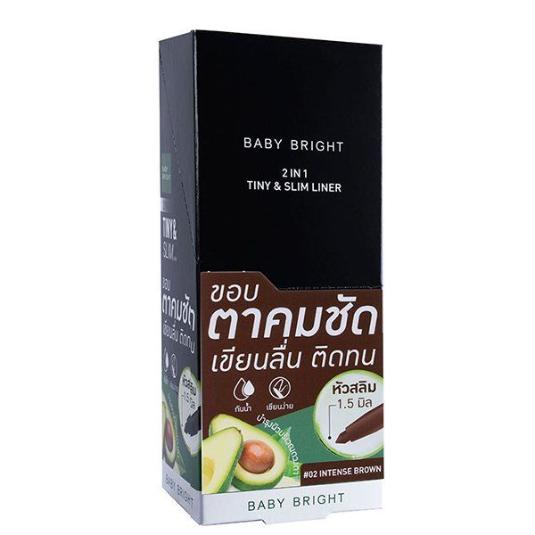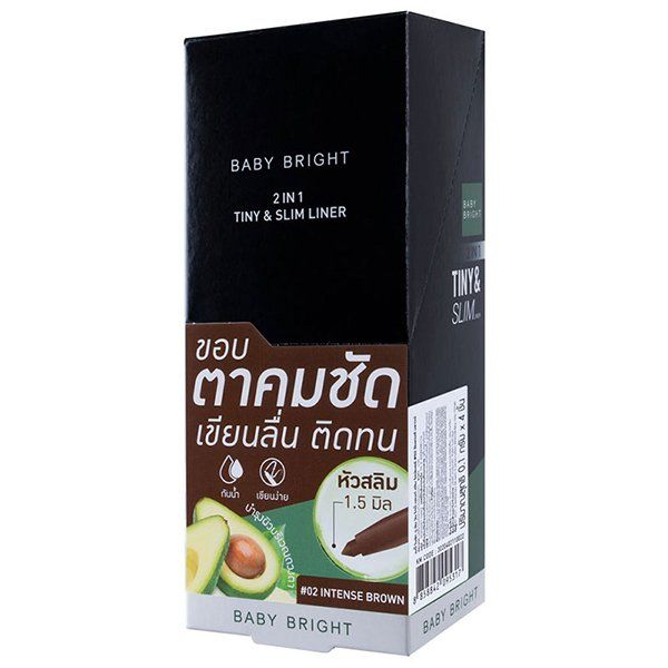 Tiny & Slim 2-in-1 Liner 0.1g by Baby Bright Make your eyes look more glamorous than ever with this 2-in-1 creamy eyeliner and inner liner! With its 1.5mm fine tip, you can create sharp, smooth lines that last. This easy-to-apply automatic pencil features a water- and sweat-resistant formula that won't budge. It contains avocado oil extract, rich in vitamins A, D, and E, to fight free radicals. Proteins from lecithin, beta-carotene, and unsaturated fatty acids help reduce the appearance of wrinkles and gently moisturize the eye area.