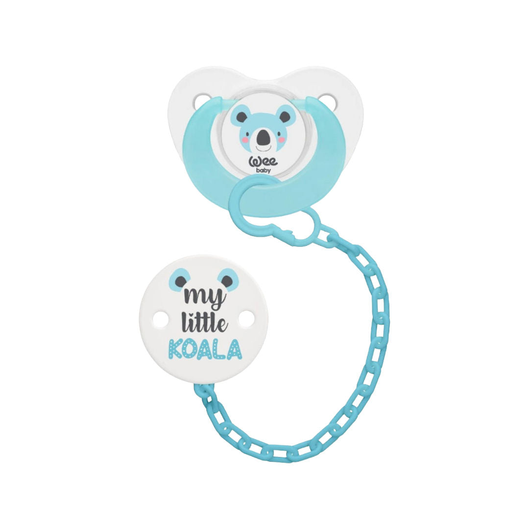 The Weebaby Soother & Soother Chain Set No.2 is an orthodontic silicone pacifier paired with a matching chain, designed for babies aged 0–6 months. It soothes and comforts while supporting healthy oral development, and the chain keeps the pacifier securely attached to clothing.