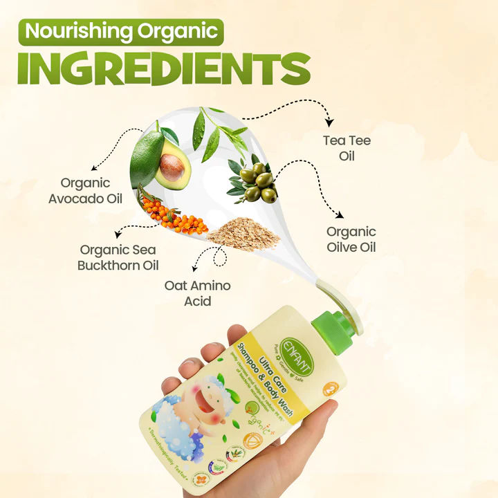 Gently cleanses and helps to reduce 99.9% of bacteria accumulation Confidently cleanses your baby with natural antibacterial formula. Specially designed for your baby with OAT AMINO BUBBLE, a natural cleansing agent. Enriched with Triple Organic Essence from Avocado Oil, Sea Buckthorn Oil and Olive Oil to moisturize skin and hair. Infused with the natural antibacterial from Tea Tree Oil.