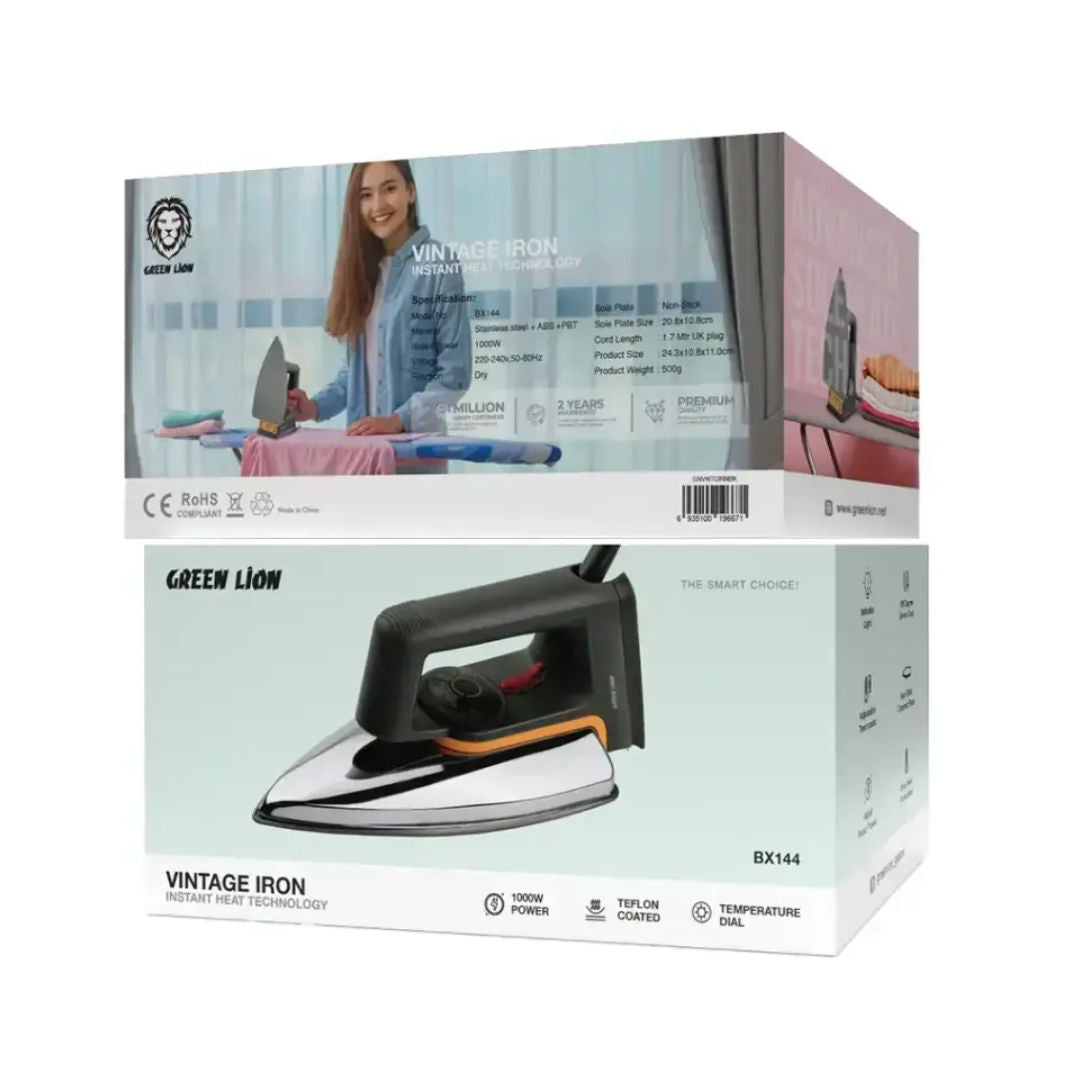 Green Lion Vintage Iron 1000W is a powerful, stylish iron that offers efficient and easy ironing. It is constructed from durable stainless steel, ABS, and PBT materials and performs efficiently. Equipped with its 1000W rated power and voltage range of 220-240V, 50-60Hz, the iron gives consistent heat for quick and efficient use. The 20.8x10.8cm non-stick ceramic soleplate glides effortlessly across the fabric without any damage and produces a flawless finish. An adjustable thermostat with a temperature dial maintains accurate heat for various fabrics. Safety is ensured by an auto-off mechanism, overheat protection, and a Teflon-coated soleplate. The 180-degree swivel cord and 1.7m UK plug are easy and convenient, and the indicator light reminds you of the state of the iron. Perfect for homes today, the Green Lion Vintage Iron is all about functionality, safety, and retro style.