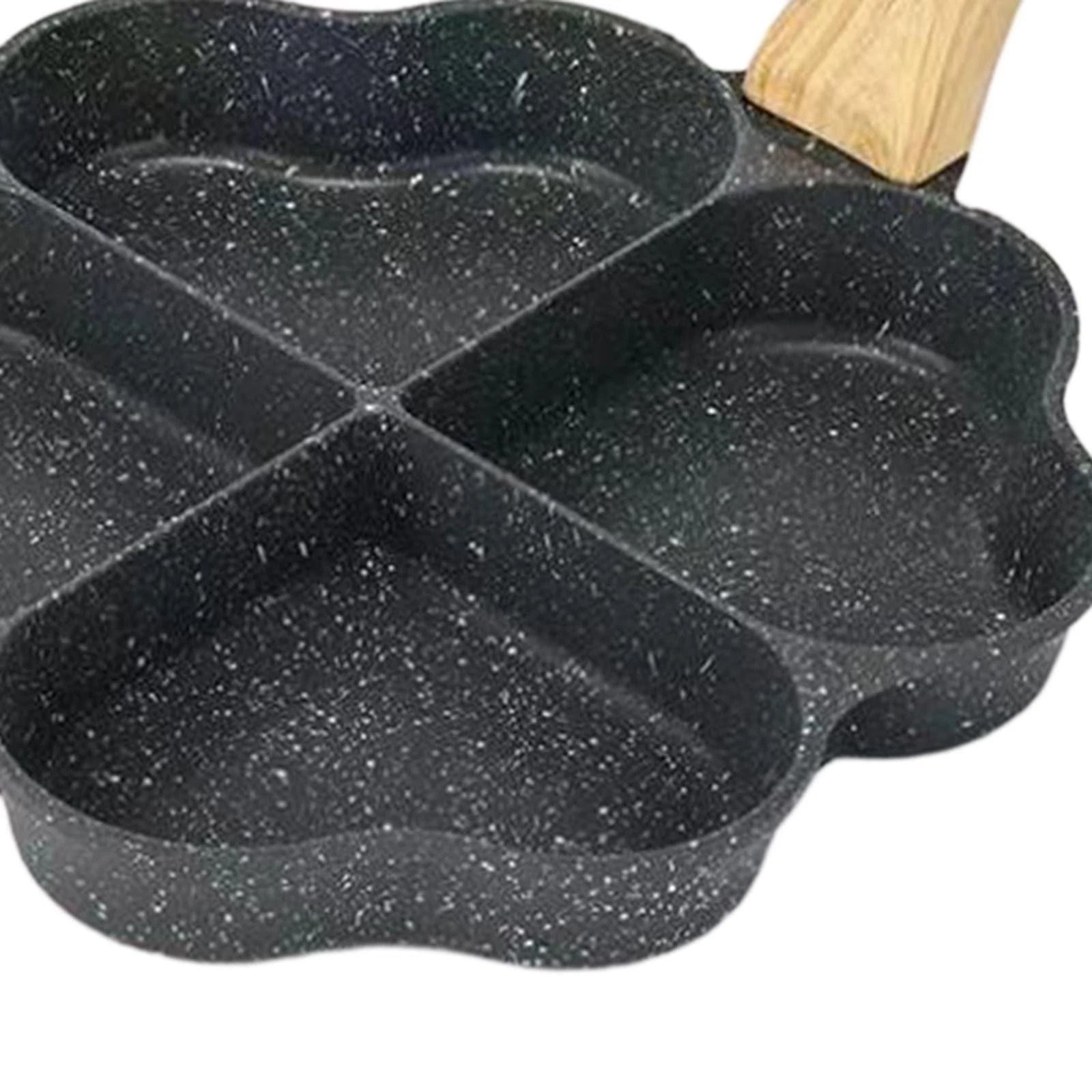 This specialised kitchen pan features four separate, heart-shaped compartments and a durable non-stick surface, perfect for simultaneously cooking decorative eggs, mini pancakes, omelettes, or burgers with a fun, uniform shape. It includes a comfortable, anti-scald wood-grain handle.