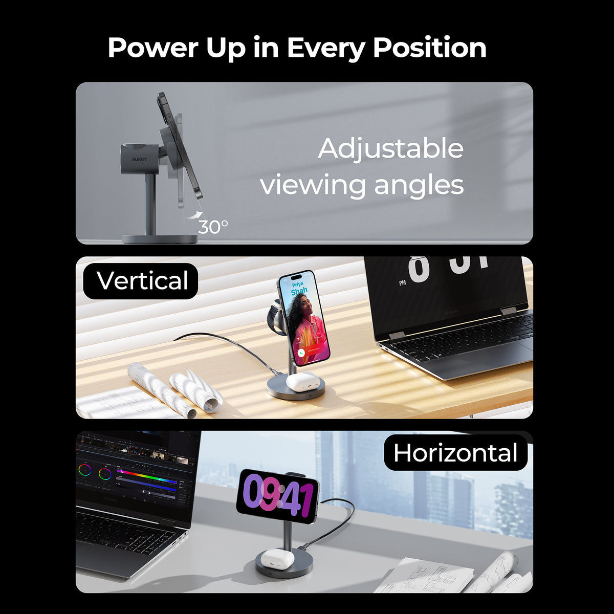 - Adjustable Viewing Angle: The phone charger is 30 degrees adjustable, suitable for different viewing angles.