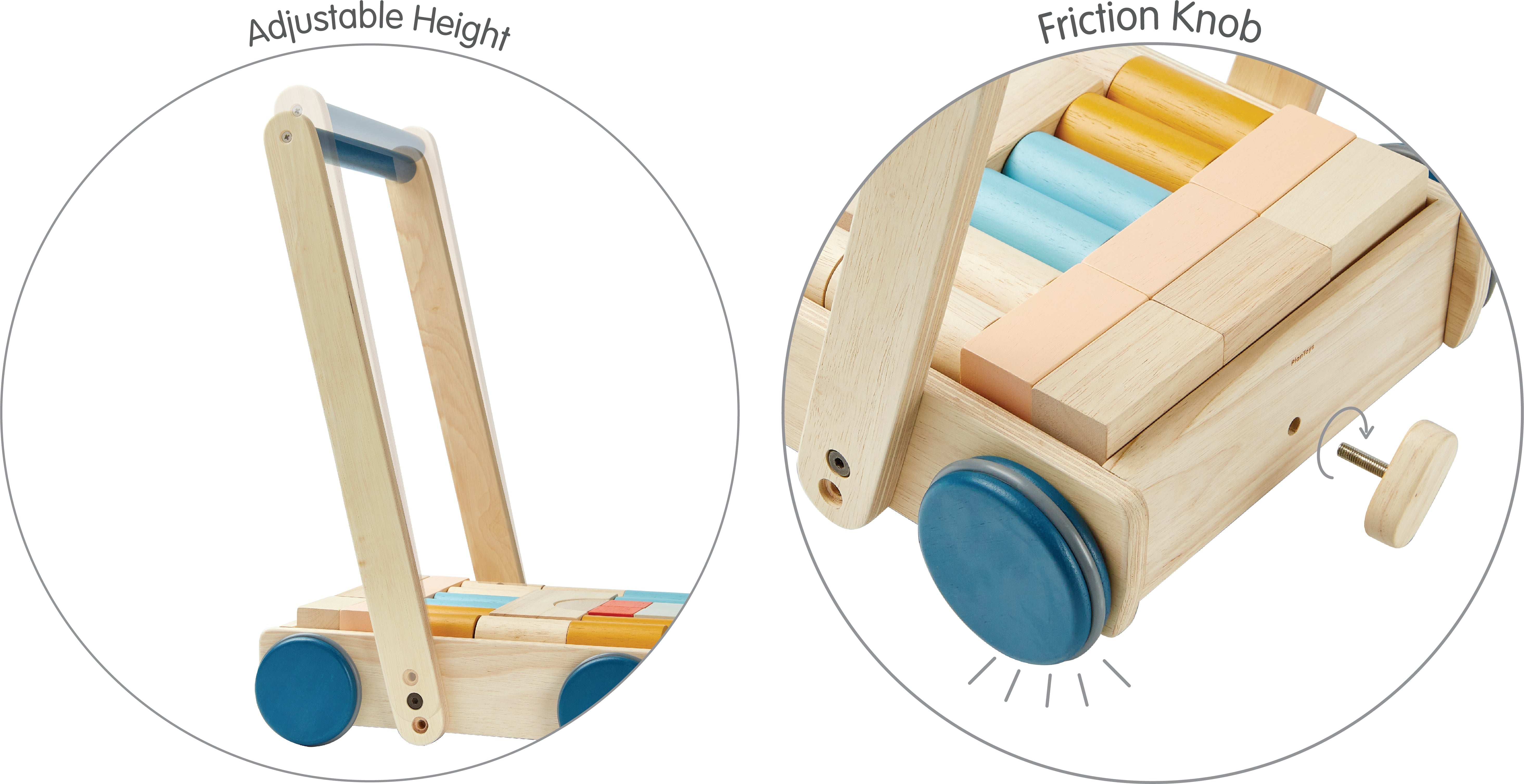 Cruise through early developmental stages with the PlanToys Baby Walker! This toy can help develop fine and gross motor skills while encouraging children to walk on their own two feet. The handle is adjustable to fit various heights. Plus, this Baby Walker comes with 13 colored and 11 natural wooden blocks so children can create and build things with their imagination.