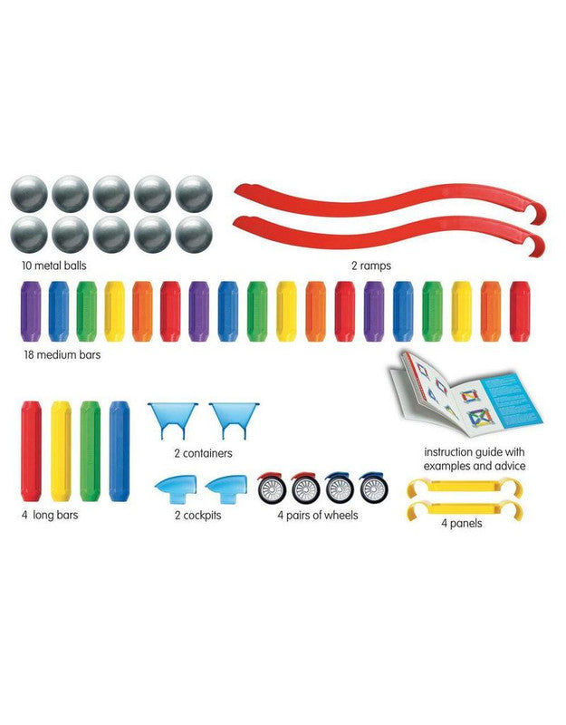 Have fun building incredible structures and vehicles with SmartMax! SmartMax allows children to explore magnetism safely. The oversized pieces are specifically designed for handling by young kids as they learn about the effects of magnetic attraction and repulsion, while older children will have fun using the pieces to construct towers, bridges and other creations. They magnets are strong enough to carry up to 60 times their weight! The Basic Stunt set is a great combination of SmartMax fun: building both structures and vehicles!