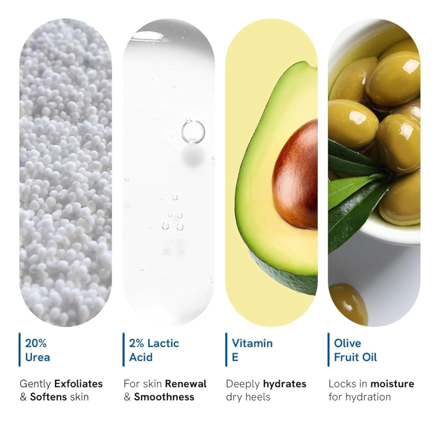 Urea (20%) – exfoliates dead skin, softens calluses, and boosts hydration
