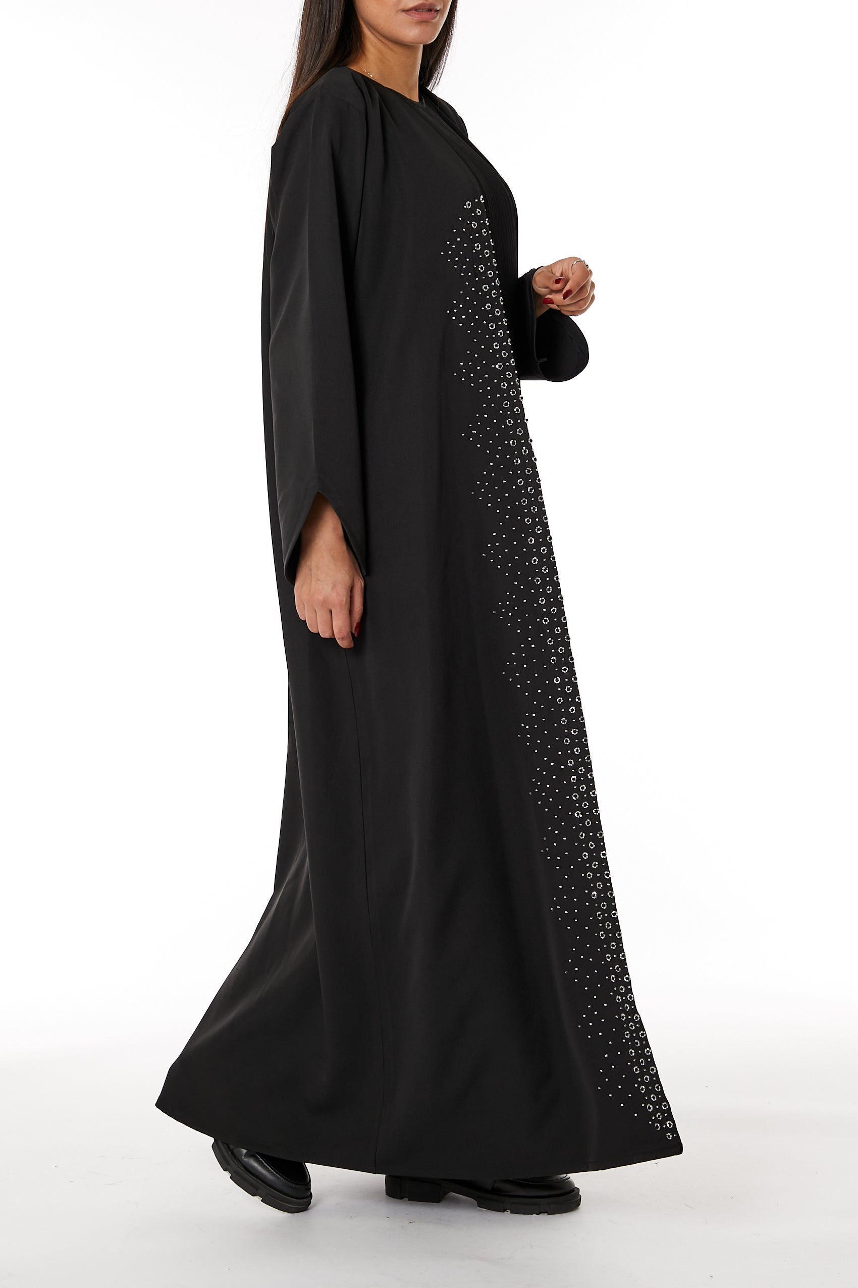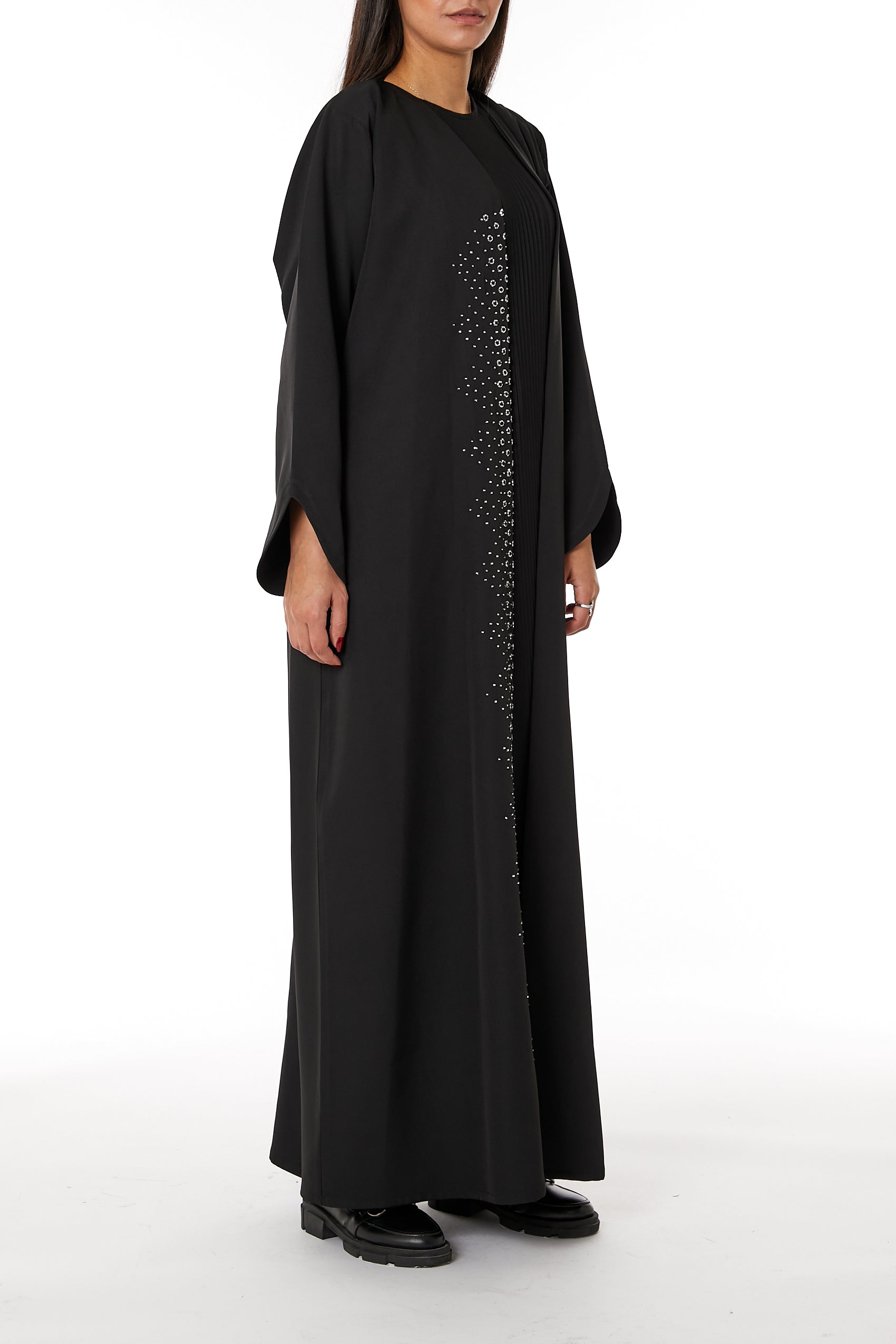 Black Round Neck Nida Fabric Split Cuffs Front Embroidered Abaya with Extra Long Sleeves, stylish addition to your modest fashion collection. Made from high-quality Nida fabric, this abaya offers both comfort and durability. The round neck design adds a touch of simplicity and elegance to the overall look, while the front embroidery detailing adds a touch of glamour. The split cuffs provide a modern twist to the traditional abaya design, making it perfect for the fashion-conscious woman. The extra-long sleeves offer a unique and stylish element, while providing additional coverage. The classic black color makes it versatile for any occasion, from work to special events. Perfect for the modern and fashion-forward woman, this abaya is a must-have in your wardrobe. Shop now and experience the beauty and grace of our Black Round Neck Nida Fabric Split Cuffs Front Embroidered Abaya with Extra Long Sleeves.