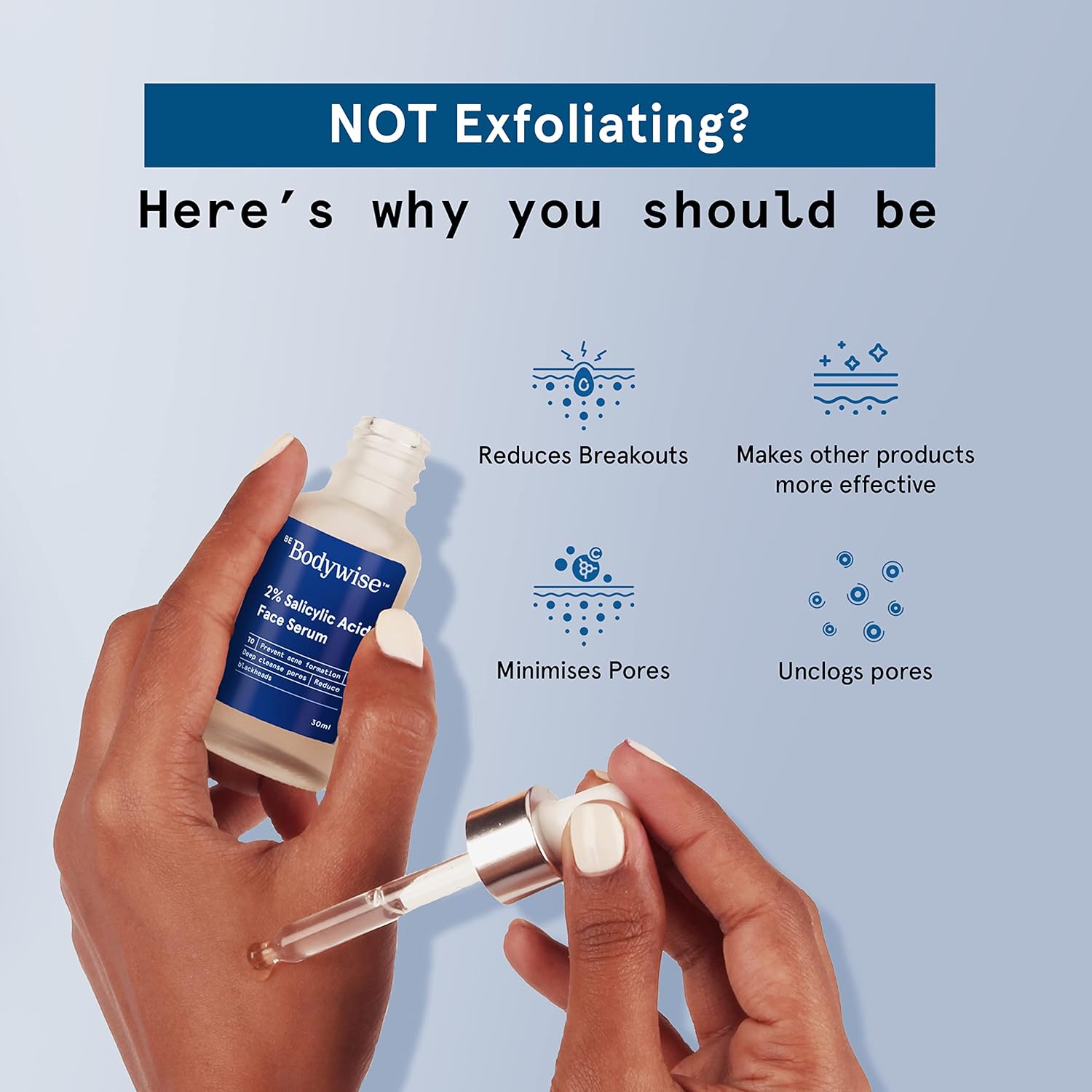 Minimizes pore appearance: The anti-inflammatory properties of Salicylic Acid serum for acne prone skin goes deep into the pores and unclog them. This action cleanses pores by removing dead skin cells and other impurities within pores allowing them to appear smaller.