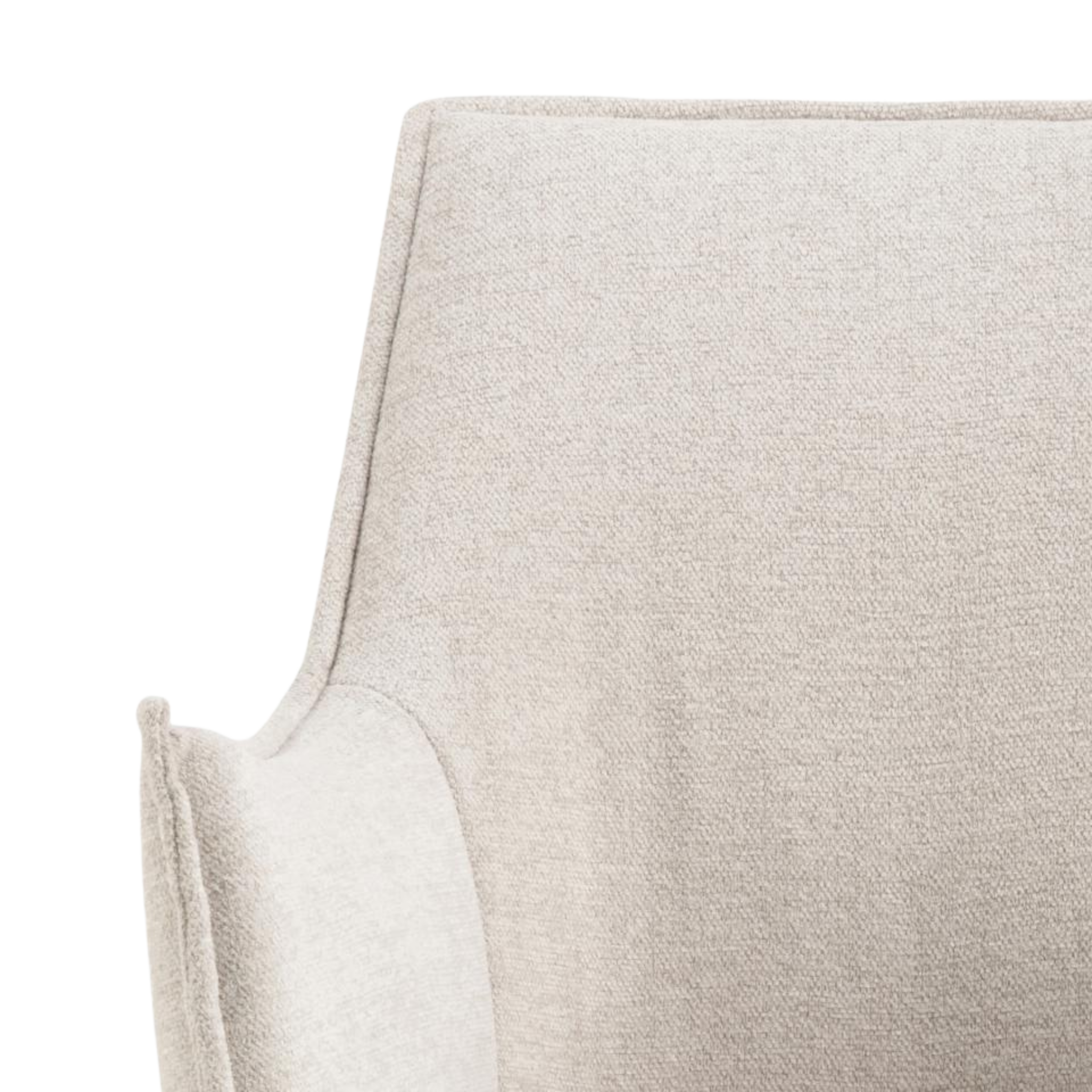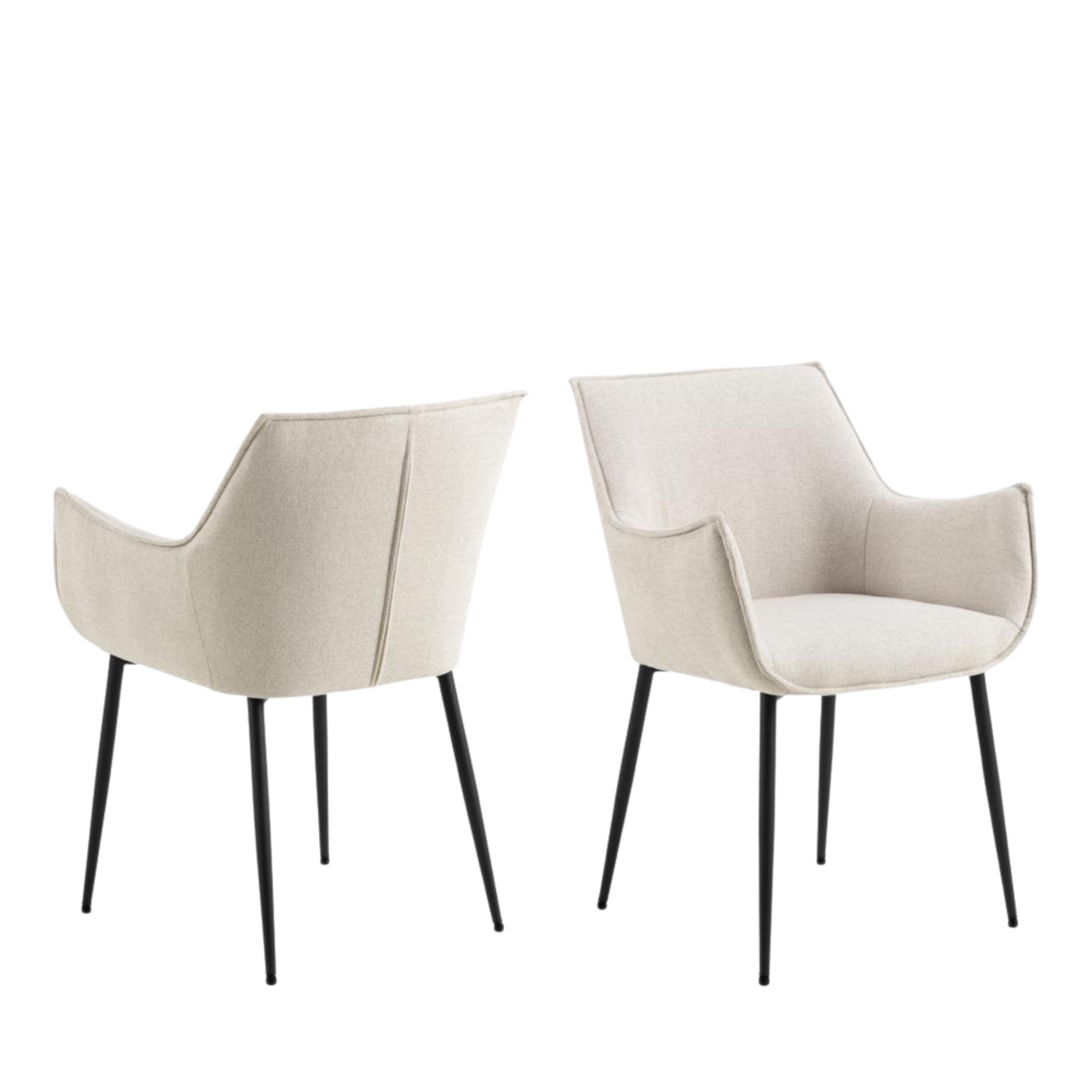 The Bonita chair showcases Apia beige fabric with sophisticated French stitching creating elegant detailing. Matt black powder coated steel base provides modern industrial contrast while armrests ensure comfortable supported dining. Zip accents add contemporary functional style. Packaged 2 per carton.