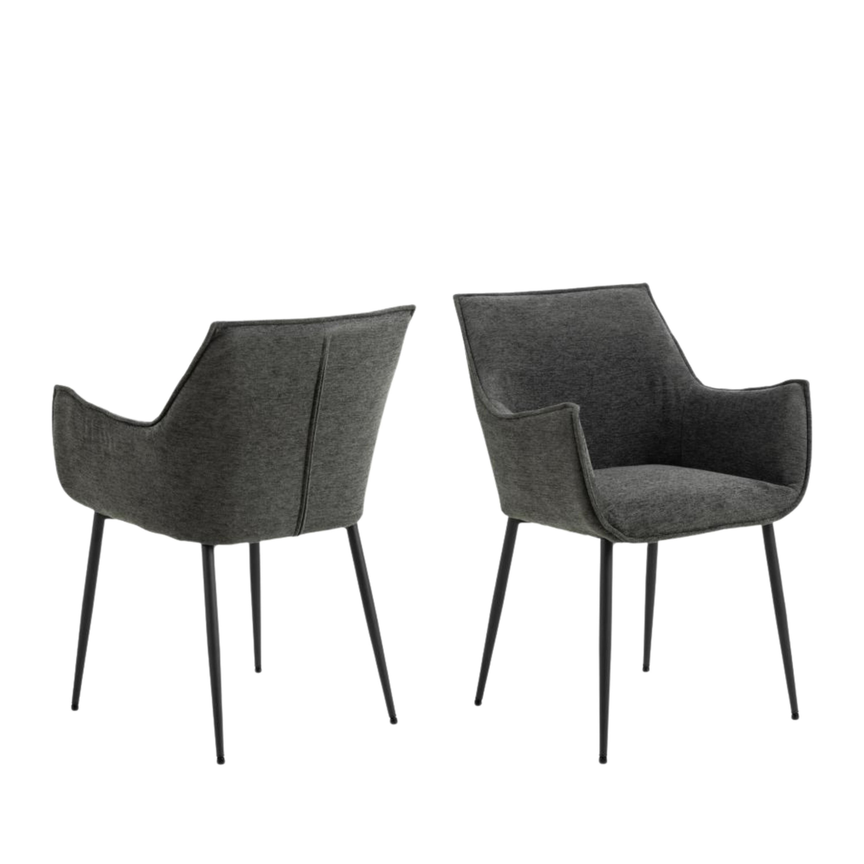 The Bonita chair showcases Apia dark grey fabric with sophisticated French stitching creating elegant detailing. Matt black powder coated steel base provides cohesive contemporary styling while armrests ensure comfortable supported dining. Zip accents add functional style. Packaged 2 per carton.