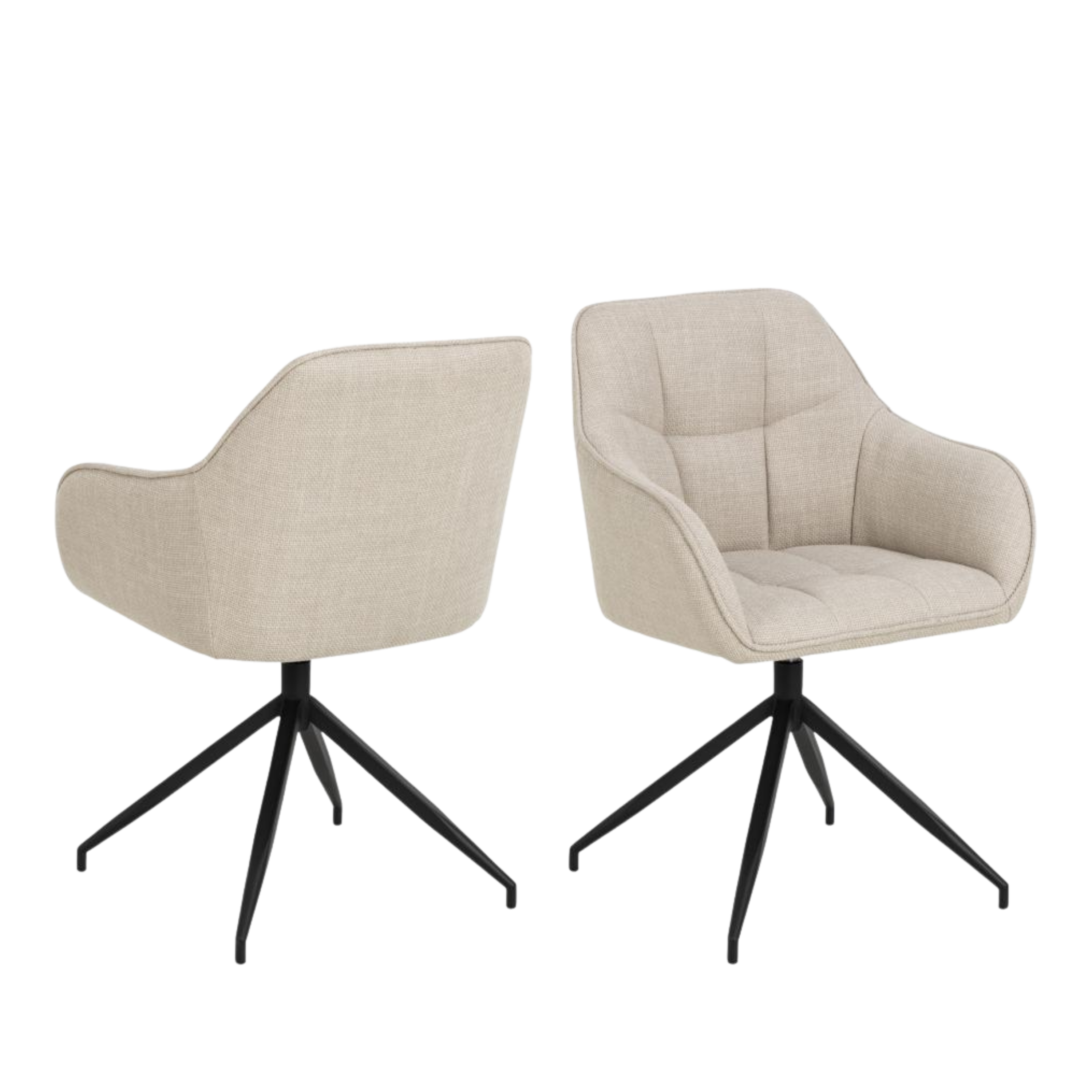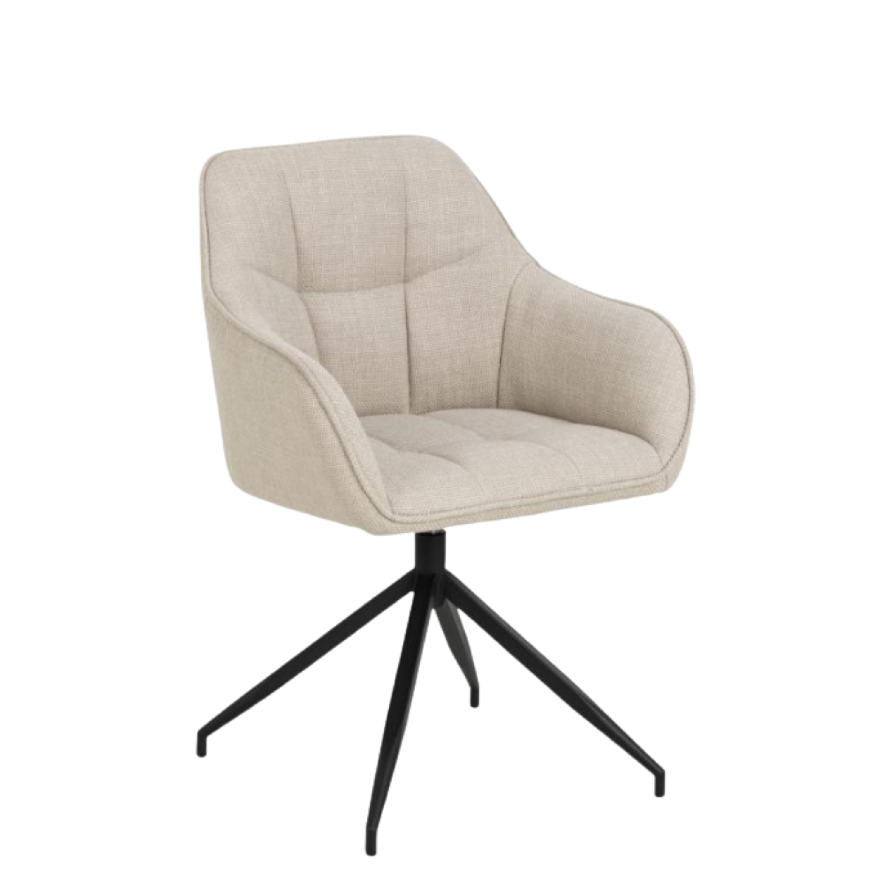 The Brenda swivel chair showcases Basel beige fabric with distinctive square stitching. The 4-star base provides stable swivel functionality while armrests ensure comfortable supported dining with convenient rotation. The geometric stitching pattern adds architectural detail with practical swivel convenience. Packaged 2 per carton.