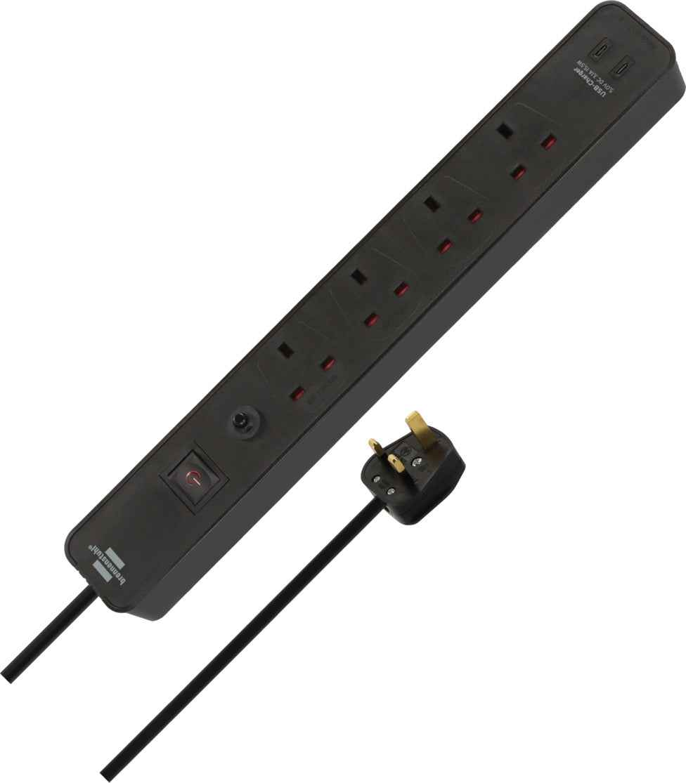 Brennenstuhl 1153243106 Ecolor 4Way 3M Extension Cable ,2 Usb C Ports,Safety Fuse, Black
