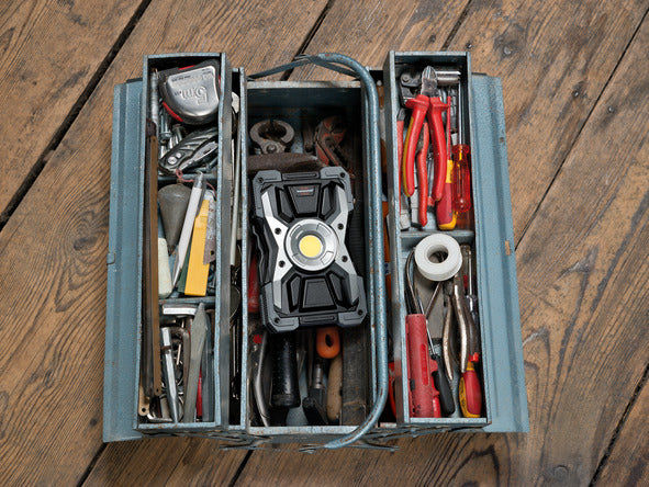 • Workshop light with charging indicator, power bank function for comfortable charging of e.g. smartphones (charging connection type C), and stable, multi-stage folding frame