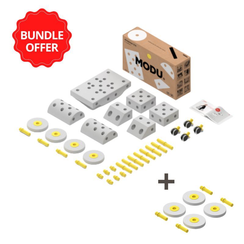 MODU Dreamer Kit - Build more than 12 unique life-size creations with the biggest MODU starter kit — all of which you can ride, rock, roll, jump, climb and balance! The play begins in the building process and continues through years of active play.
