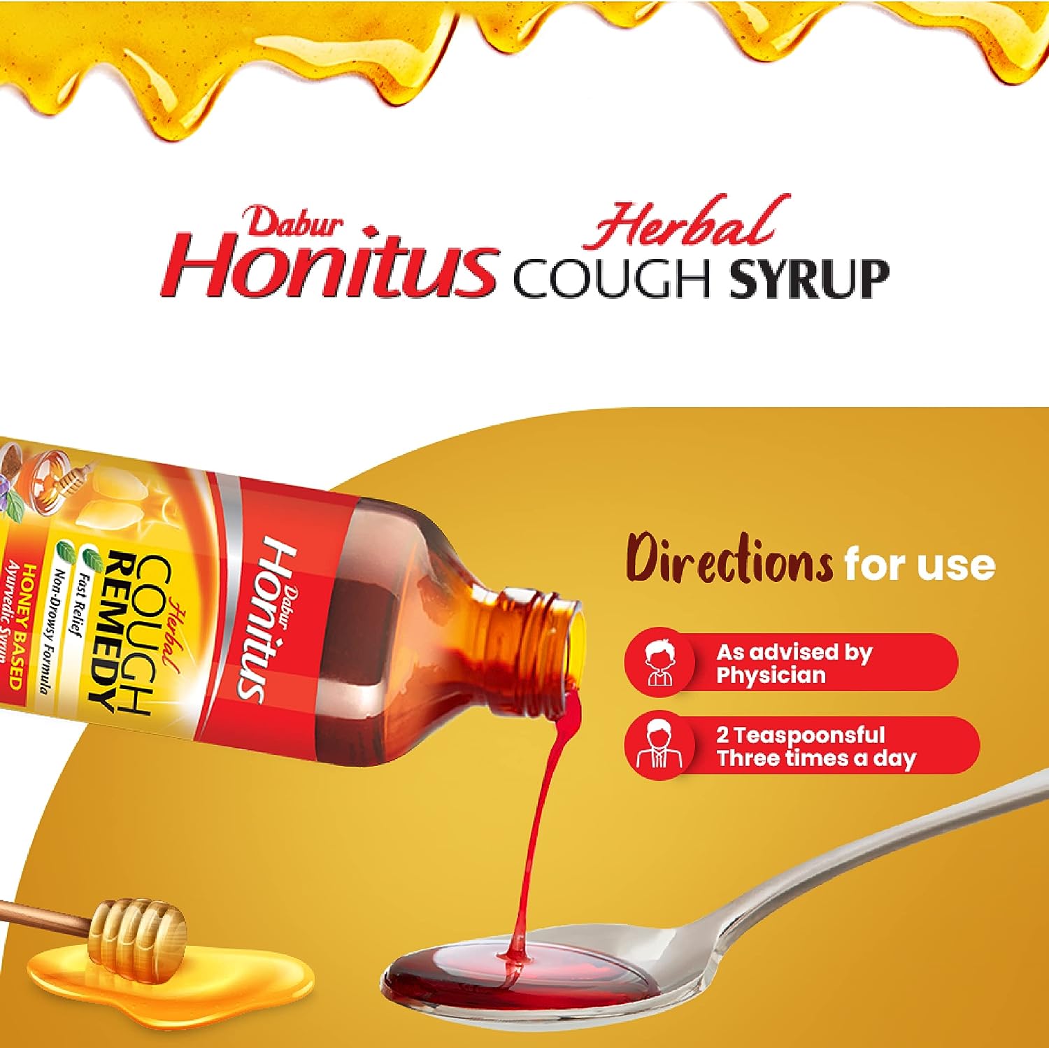• DIRECTIONS FOR USE: Dabur Honitus Cough Syrup can consumed as per following dosage: Adults: 2 tea spoon 3-4 times a day, Children above 2 years can it take 3 - 4 times a day.