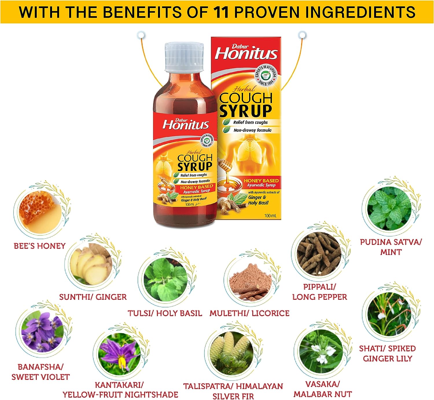 • NATURAL INGREDIENTS WITH MULTIPLE BENEFITS : Honitus Cough Syrup contains Honey, which relieves cough and throat irritation, Holy Basil (Tulsi), which acts as an anti-tussive, Ginger, which relieves cough, and Banafsha, which acts as an expectorant.