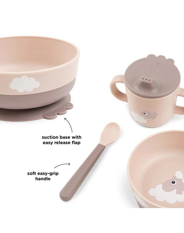 This green set features Croco and Birdee among the clouds. Includes a bowl with a suction base, a 2-handle cup with a removable spout lid, and a feeding spoon. Heat-resistant, microwave and dishwasher safe.