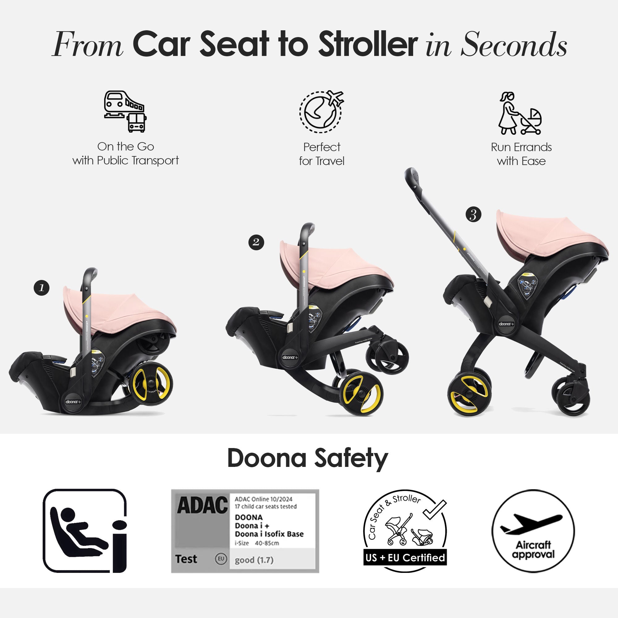 Doona is the world’s first complete and fully integrated travel system, allowing you to move from car seat to stroller in seconds. The innovative design allows you to navigate the streets at ease, without disturbing your sleeping child when hopping in a car, traveling by bus or walking up the stairs. The revolutionary car seat and stroller provides a safe and practical solution for parents on-the-go.