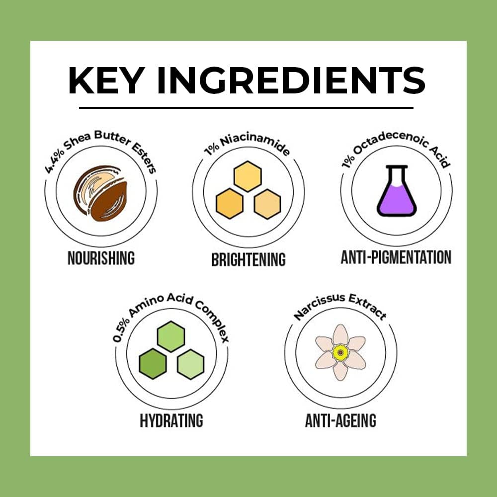 HOW IT WORKS: Shea Butter is the ultimate hydrator to help moisturize, nourish and protect your skin. Amino Acids are essential to soothe your skin and help retain its moisture levels. Octadecenoic Acid is one of the only ingredients studied to fight hyperpigmentation on Indian skin. Narcissus Extract refines pores and reduces unwanted oiliness.