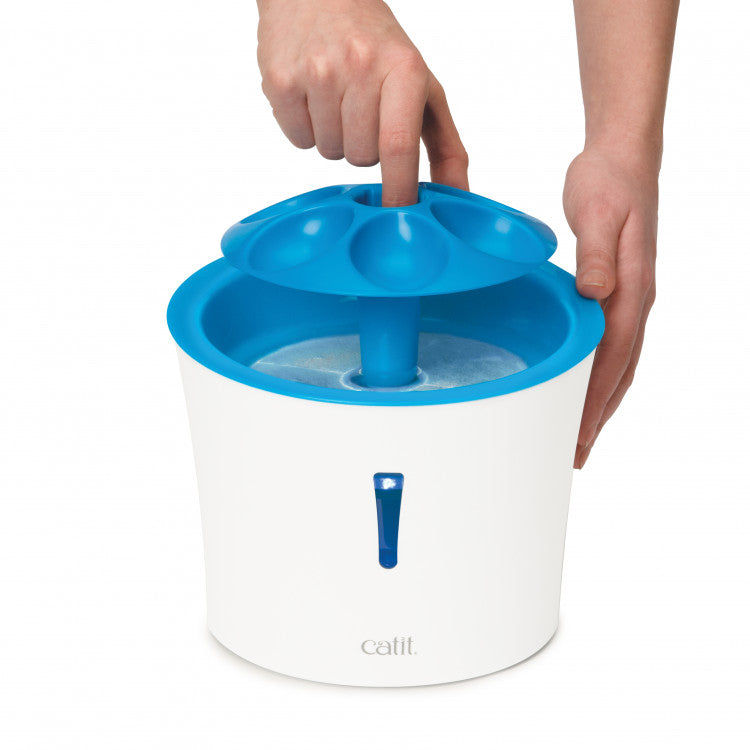 The petal top enables your cat to drink even when the fountain is turned off. Features handy water level indicator window with LED nightlight. Allows 3 water flow settings for picky drinkers. Includes Triple Action Filter for clean water at all times. BPA-free (all components excluding adapter)