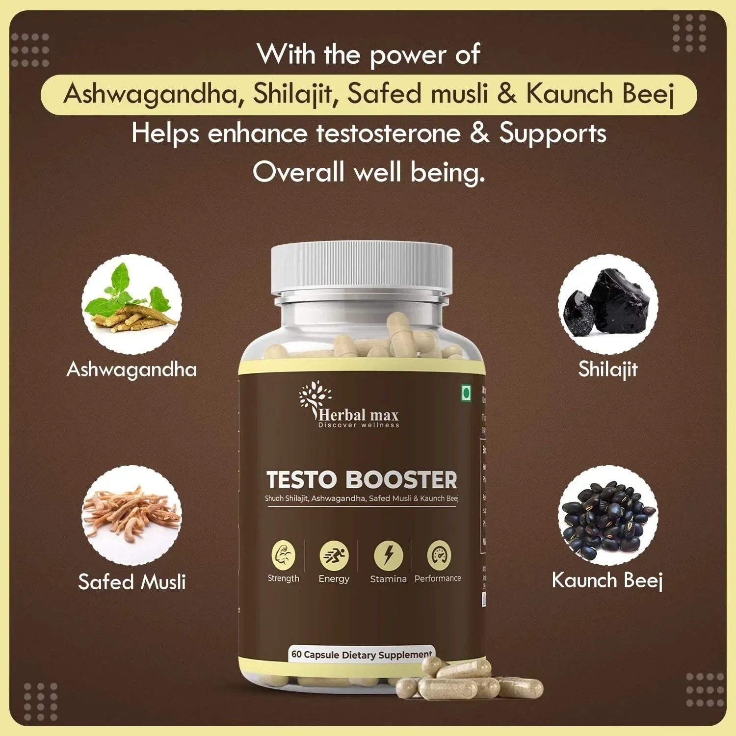 Great value: With a high-quality, scientifically backed formula, Herbal max testo booster offers great value for men looking to naturally enhance their testosterone levels and improve their overall health and fitness.Ayurvedic Ingredients: Our formula contains Ashwagandha, Shilajit, Safed Musli, Gokshura, and Shatavar and total 10 natural herbs
