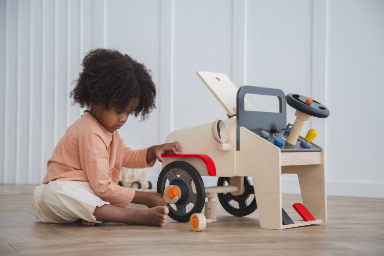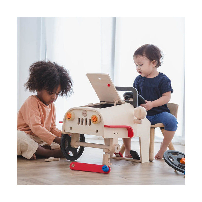 Get excited about the multiple realistic features that this Motor Mechanic offers - a steering wheel, gearshift, horn, brake, accelerator, turnable car key, air conditioner, radio, side mirrors, hood lift support and screw jack. The mechanical tool in the front can be used to change tires while all tools can be kept in the storage space in the front. This set sparks imagination and encourages role-play; and all parts of this toy are playable!