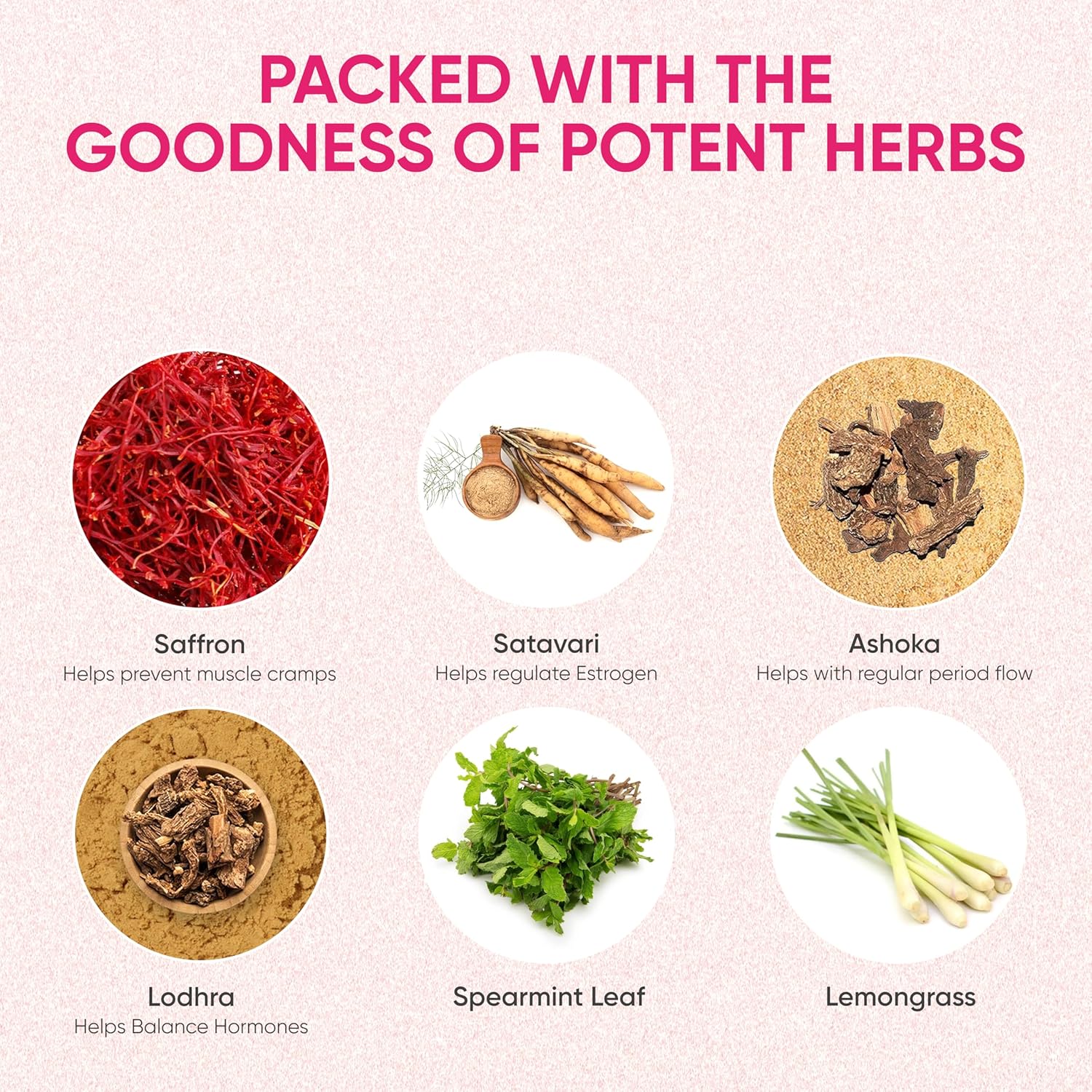 The herbal ingredients work synergistically: Ashoka and Lodhra support menstrual health; Shatavari and Ashwagandha assist in hormonal balance and stress relief; Saffron helps reduce inflammation. Together, they help restore internal harmony over time.
