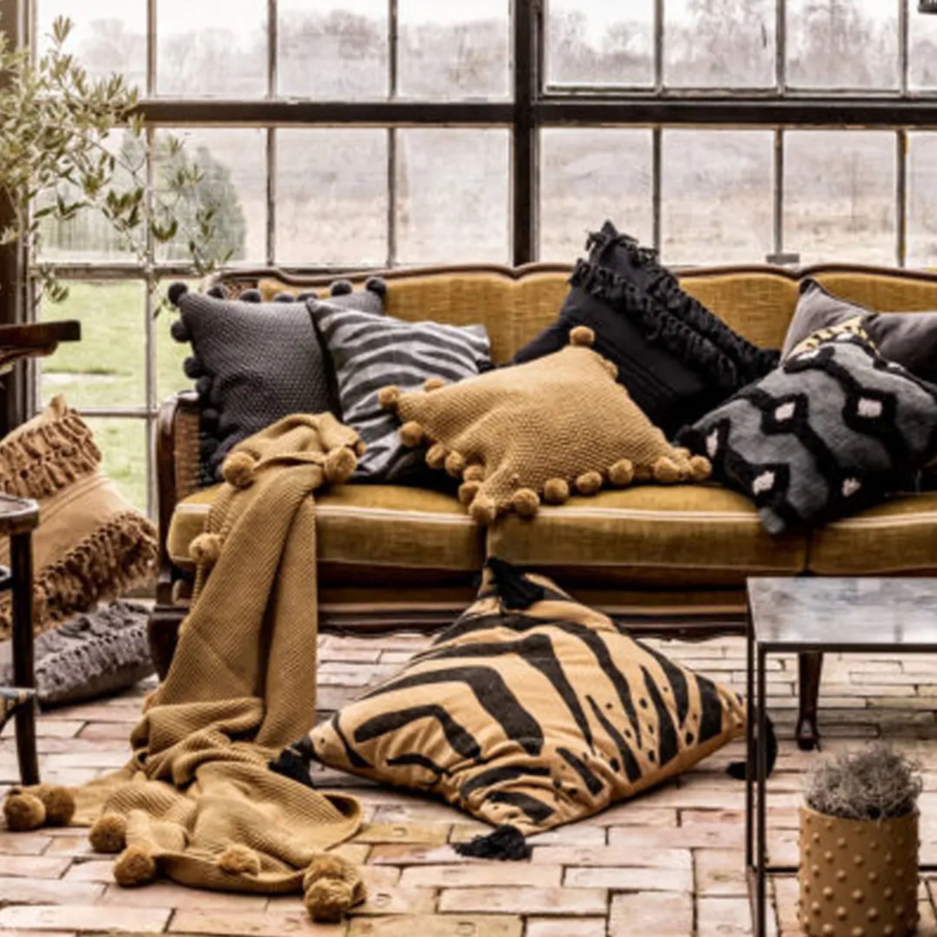 The Sambora cushion cover creates bold dramatic presence perfect for sofas, chairs, or statement displays with black/yellow contrast and tassels bringing striking character ideal for contemporary, eclectic, or bold interiors.