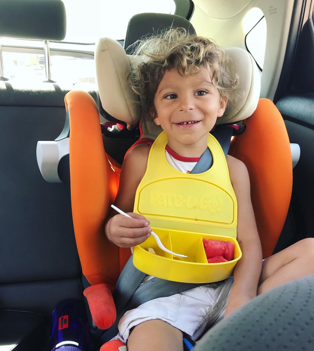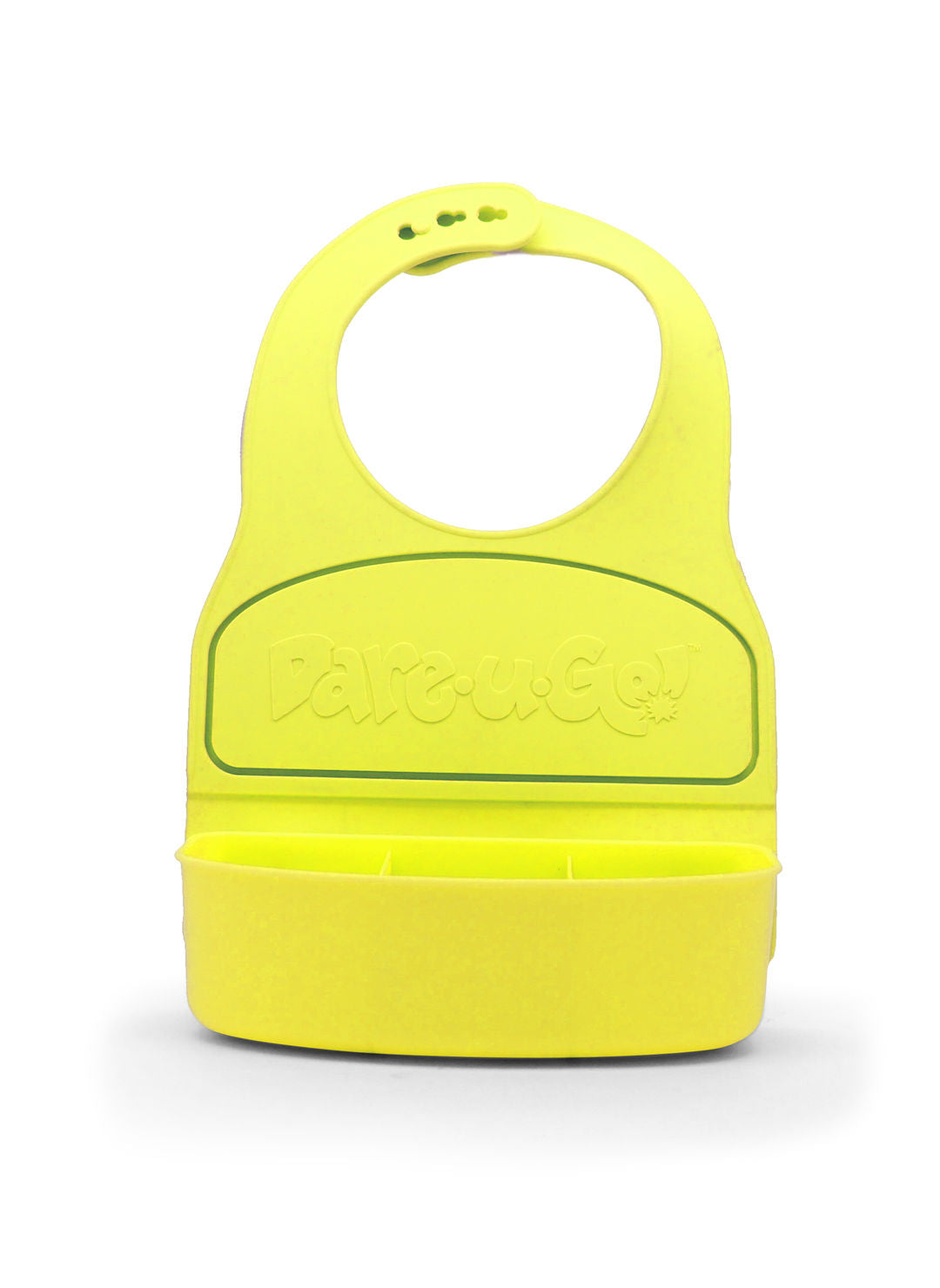 Dare-U-Go! is a 5-in-1 solution that simplifies feeding your little ones on-the-go. Designed with travel in mind, Dare-U-Go! folds into a food storage unit that seals airtight. It not only catches food, the bib keeps clothes clean, it is easy to wipe down and with built in dividers, food doesn't touch! A spork is also included. All One-Piece! Say Good-bye to the extra laundry & dishes!