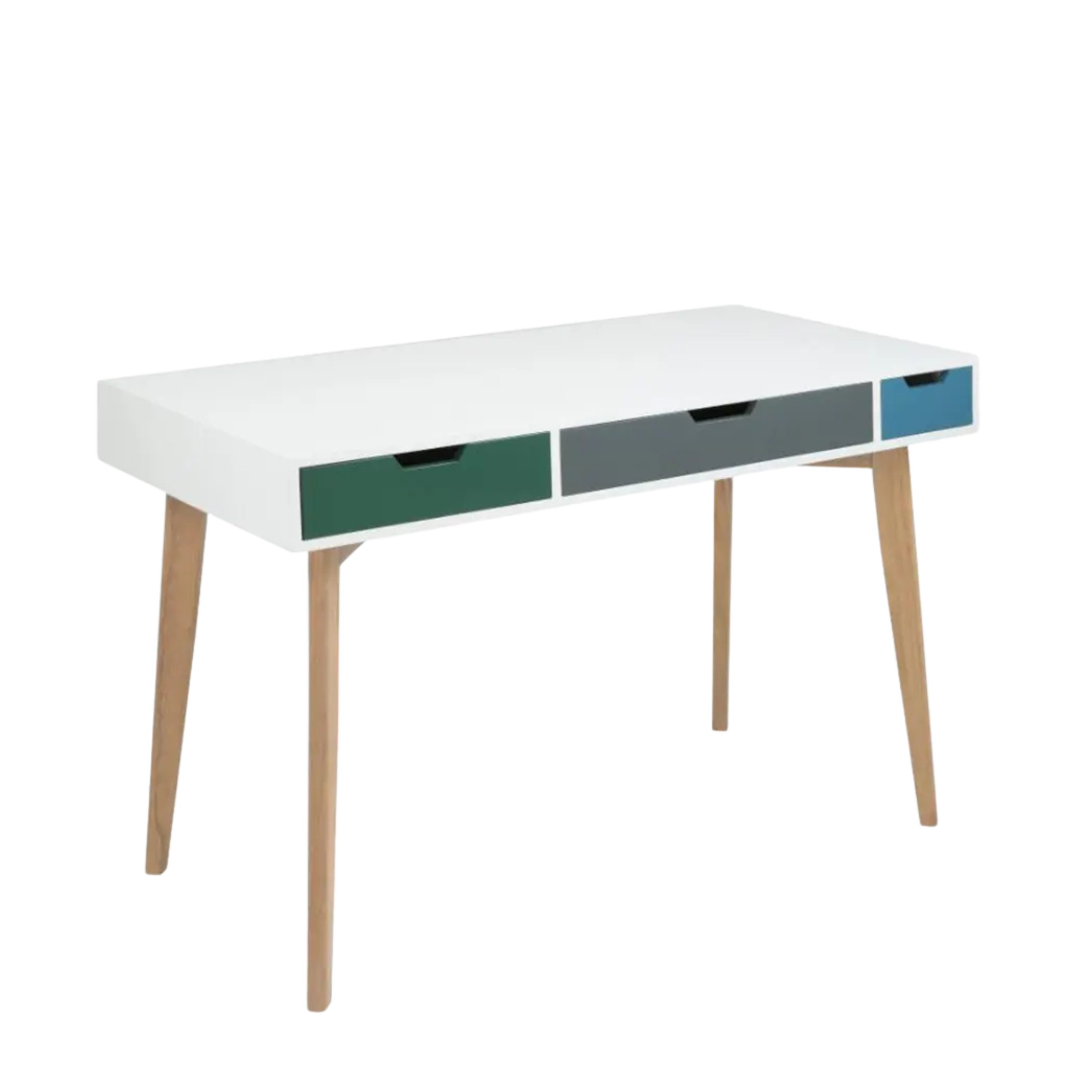 The Tess desk brings playful sophistication with its white MDF top and three multi-colored drawers. Supported by solid ash wood legs, this desk combines Scandinavian aesthetics with practical storage.