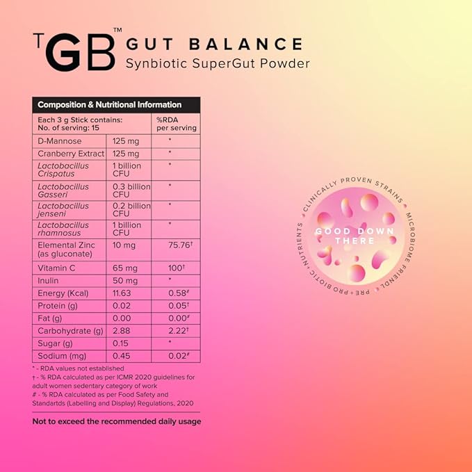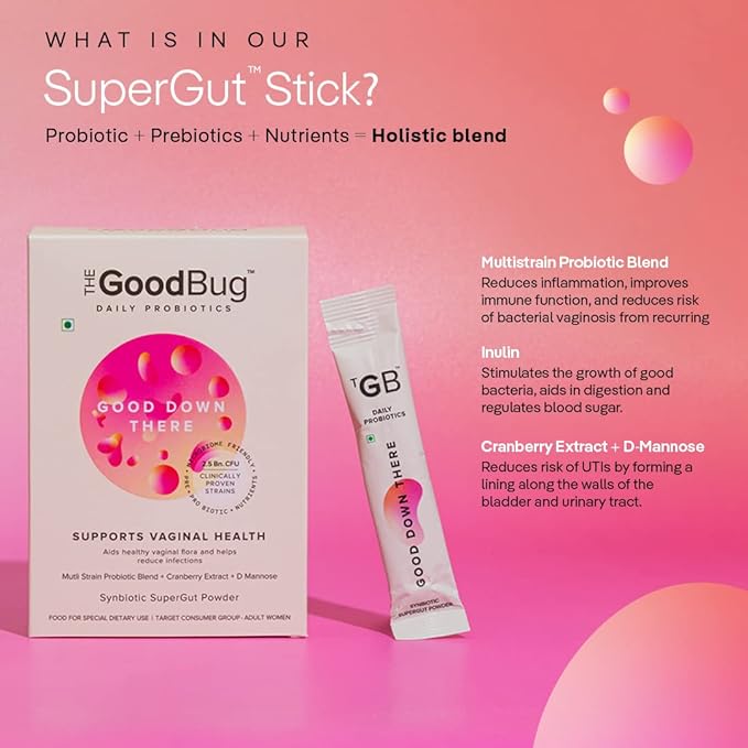 DAILY GUT & SELF-CARE IN A STICK! India's first-of-its-kind Synbiotic stick with a unique formulation of precision probiotic blend of Lactobacillus strains, potent prebiotic fibre & ther goodness of valuable nutrients that will repopulate your gut with healthy bacteria that will support digestive health, support healthy vaginal flora & helps protect from discharge, UTIs and other infections.