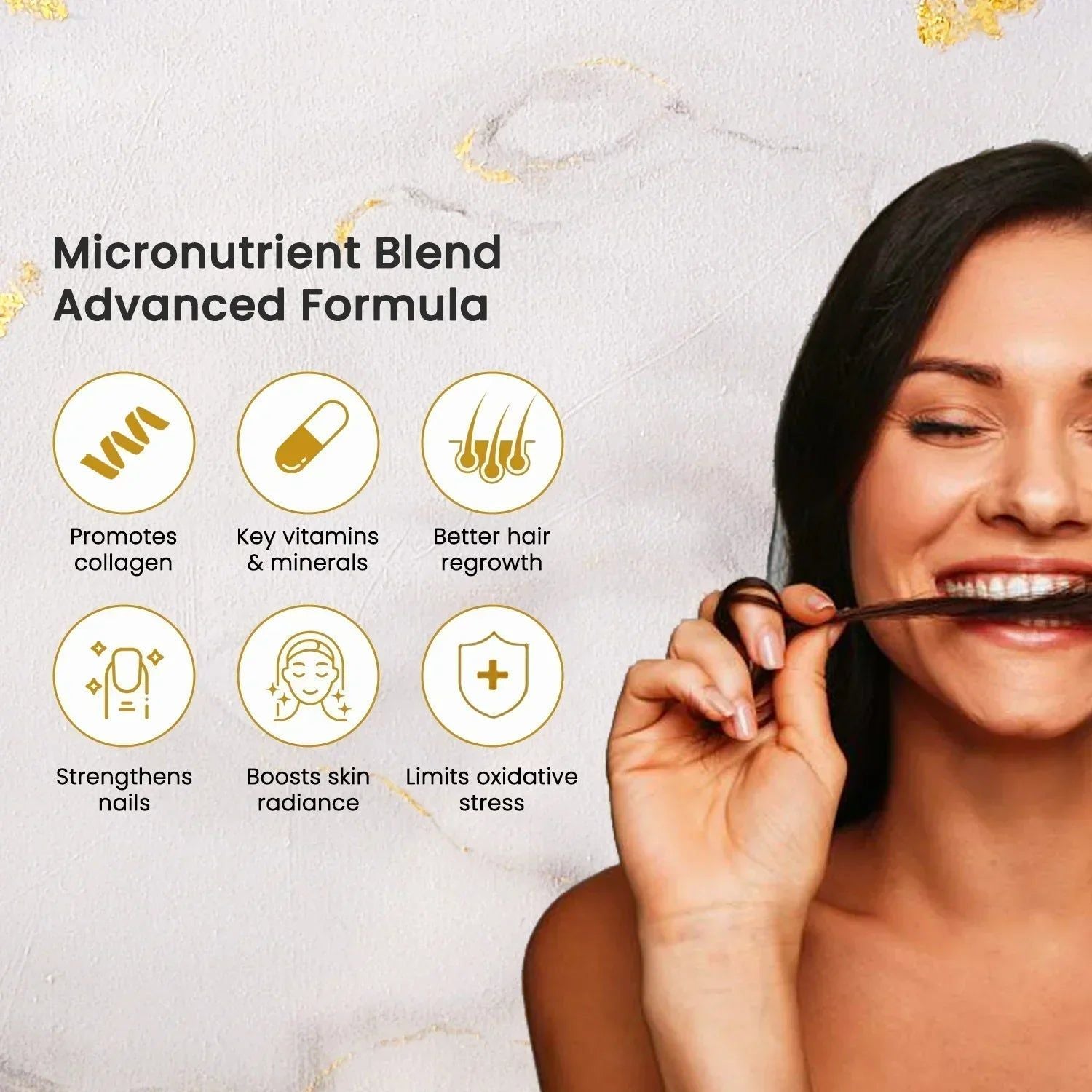 Beautiful hair and skin on the exterior require good foundations on the inside, and collagen is responsible for much of this interior structure. Hair+ contains easily absorbed marine collagen peptides that promote hair growth and skin elasticity while leaving no unpleasant odor or aftertaste.