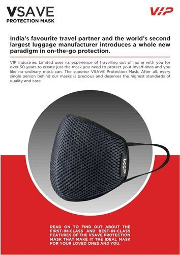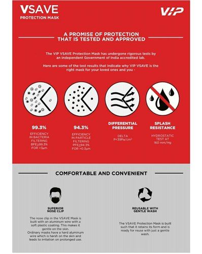 6 Layer protection technology, 99.3% Bacteria Filtering, 94.3% Particle Filtering, Adjustable Nose Clip, Bio Contoured for Indian Faces, Skin FriendlyDescriptionVSAVE Protection MaskOuter Fabric - Air MeshInner Fabric - 100% knitted cotton care instruction: Washable with a gentle wash.