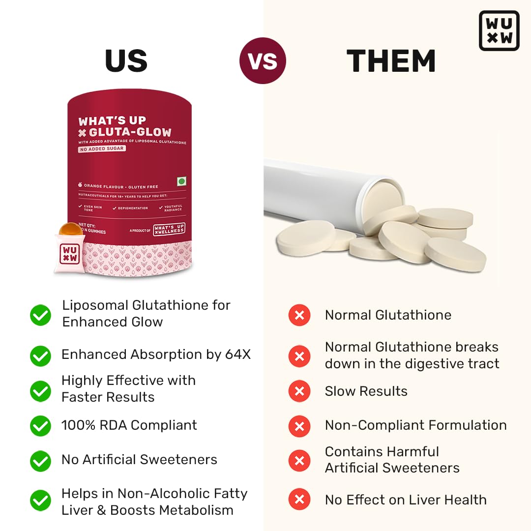 ENHANCED ABSORPTION - What’s Up Liposomal Glutathione is not to be confused with l-glutathione for skin (reduced glutathione). Our glutathione gummy skin supplement employs a cutting-edge liposomal delivery system that safeguards nutrients against digestion. Liposomal Glutathione has higher absorption rate, which is over 64x higher than that of standard glutathione tablet supplements. Traditional glutathione pills and skin whitening capsules are less absorbable and bioavailable.